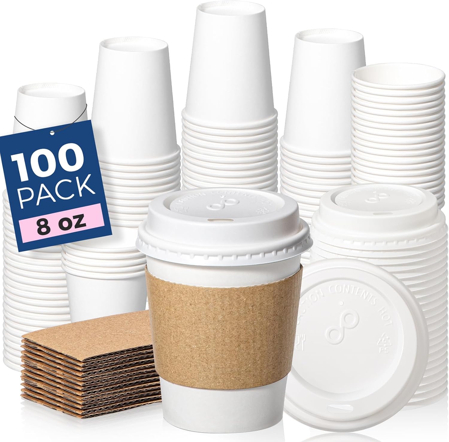 Fit Meal Prep 100 Pack 8 oz Disposable Coffee Cups with Lids, Sleeves, Leak-Proof To Go Coffee Cups with Lids, Durable Hot Paper Cups for Home, Office, Party, Business