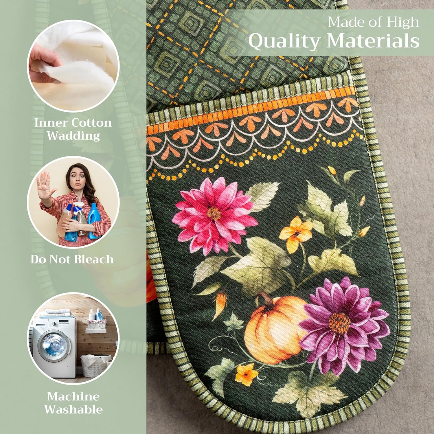 Maison d' Hermine Double Oven Mitts 100% Cotton 7"x35" Double Oven Mitt Heat Resistant BBQ Cooking Gloves with Loop, Baking, Grilling, Home, Kitchen, Handling Hot Pans (Pumpkin Garden - Dark Green)