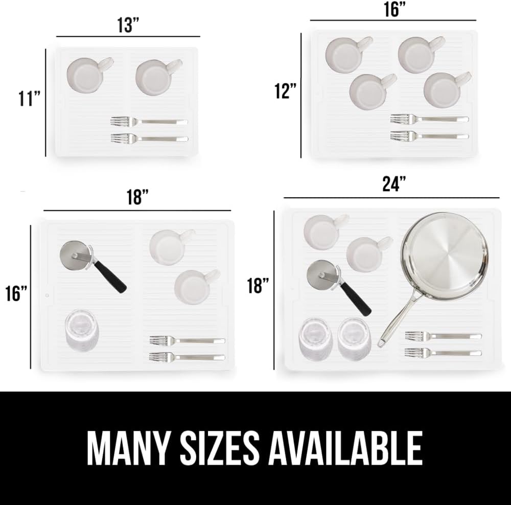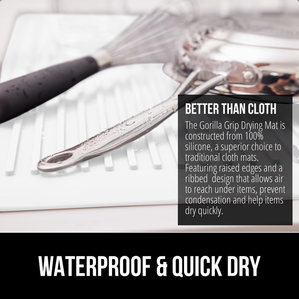 GORILLA GRIP 100% BPA-Free Patented Silicone Dish Drying Mat for Kitchen Counter, 18x16 Inch, Water Catching Ribbed Design, Easy Clean Waterproof Sink Liner, Heat Resistant, Fits Under Rack, White