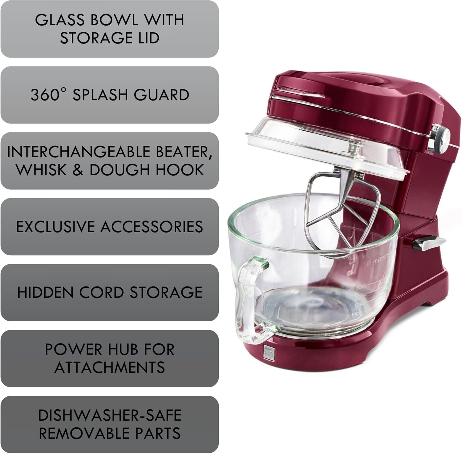 - EXCLUSIVE ACCESSORIES - The kenmore ovation stand mixer comes with interchangeable flat beater, dough maker hook, and wire whisk. it also includes a 5 qt glass bowl with a storage lid, wide-mouth funnel, egg separator, and ingredient grater/zester designed to fit the ovation's pour-in opening. these accessories enhance the mixer's functionality and versatility.