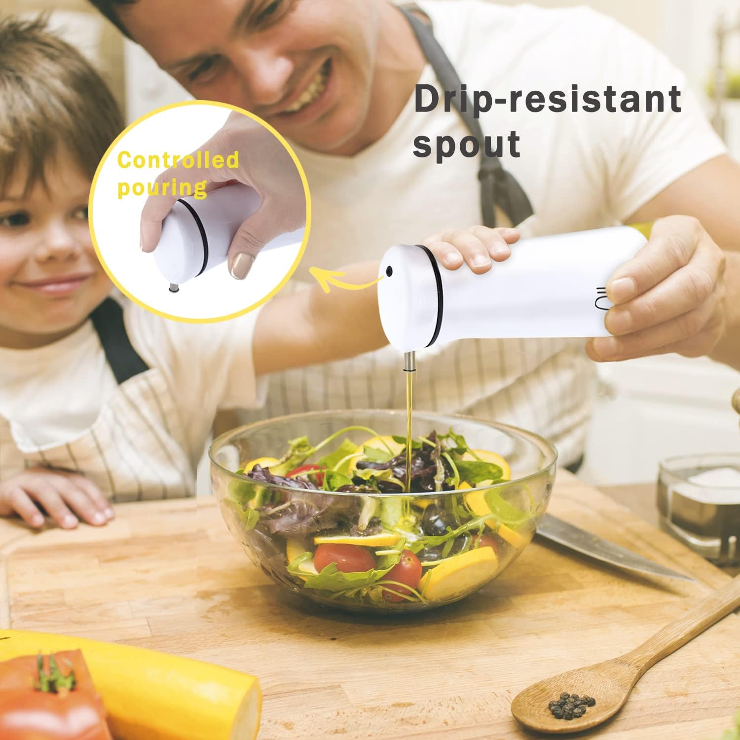 - No-Drip Oil Bottle: Thanks to the functional design of the oil mouth, no more dripping from the mouth. The non-drip feature of the oil vinegar dispenser ensures that your kitchen stays clean.