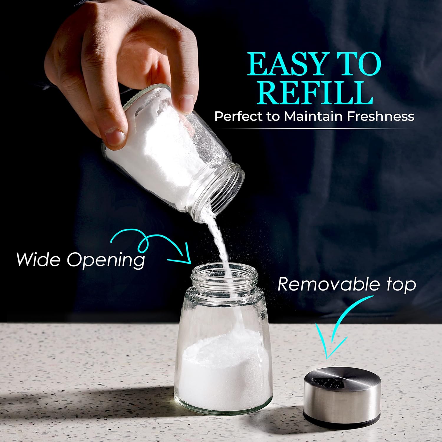 - ✅ Easy to use – A handy shakers set with a perfect size of 4 inches tall and holds around 1/2 cup of spices. You fill it once via wide opening and it serves you, without the need to constantly refill.