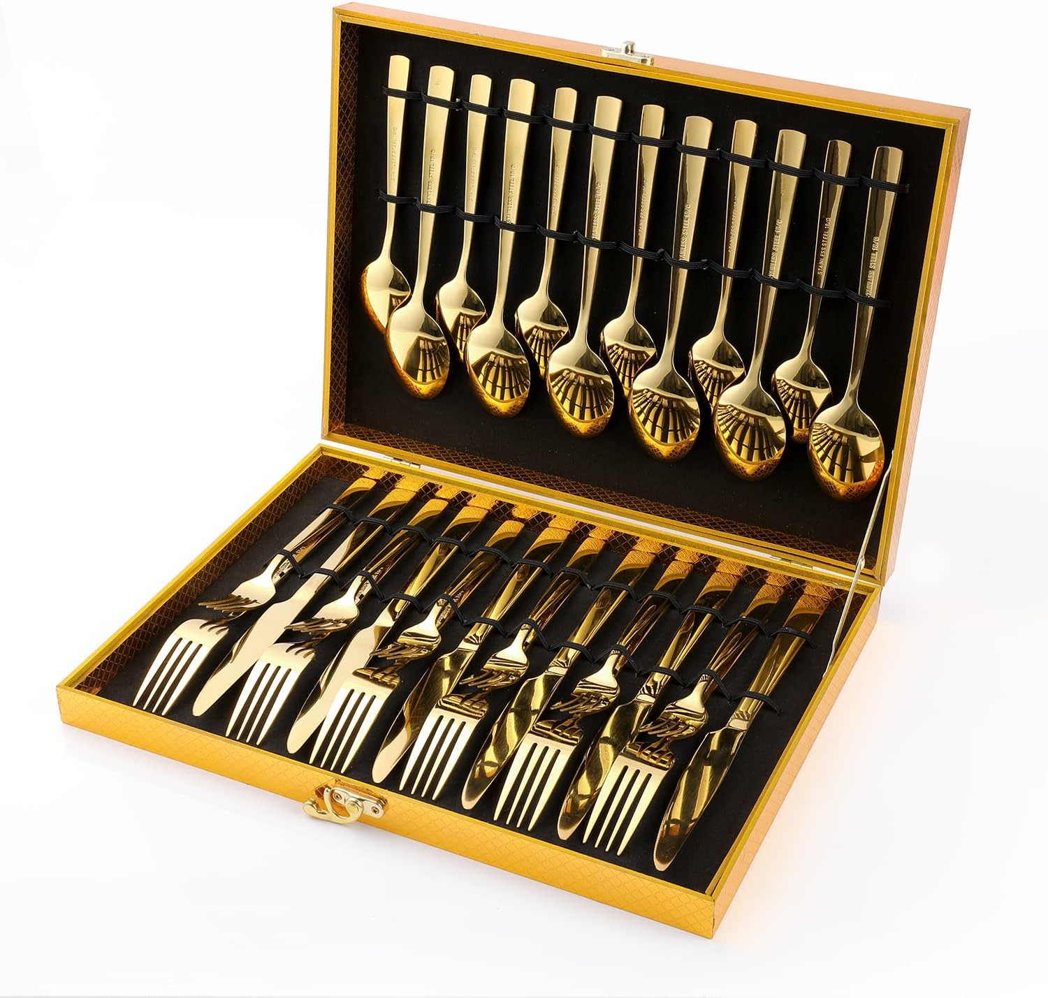 - ă30 PIECES GOLD SILVERWARE SET FOR 6ă: This new square handle silverware set comes with 6 Dinner Forks, 6 Salad Forks, 6 Dinner Knives, 6 Dinner Spoons and 6 Tea Spoons, ideal for home, kitchen or restaurant use.
