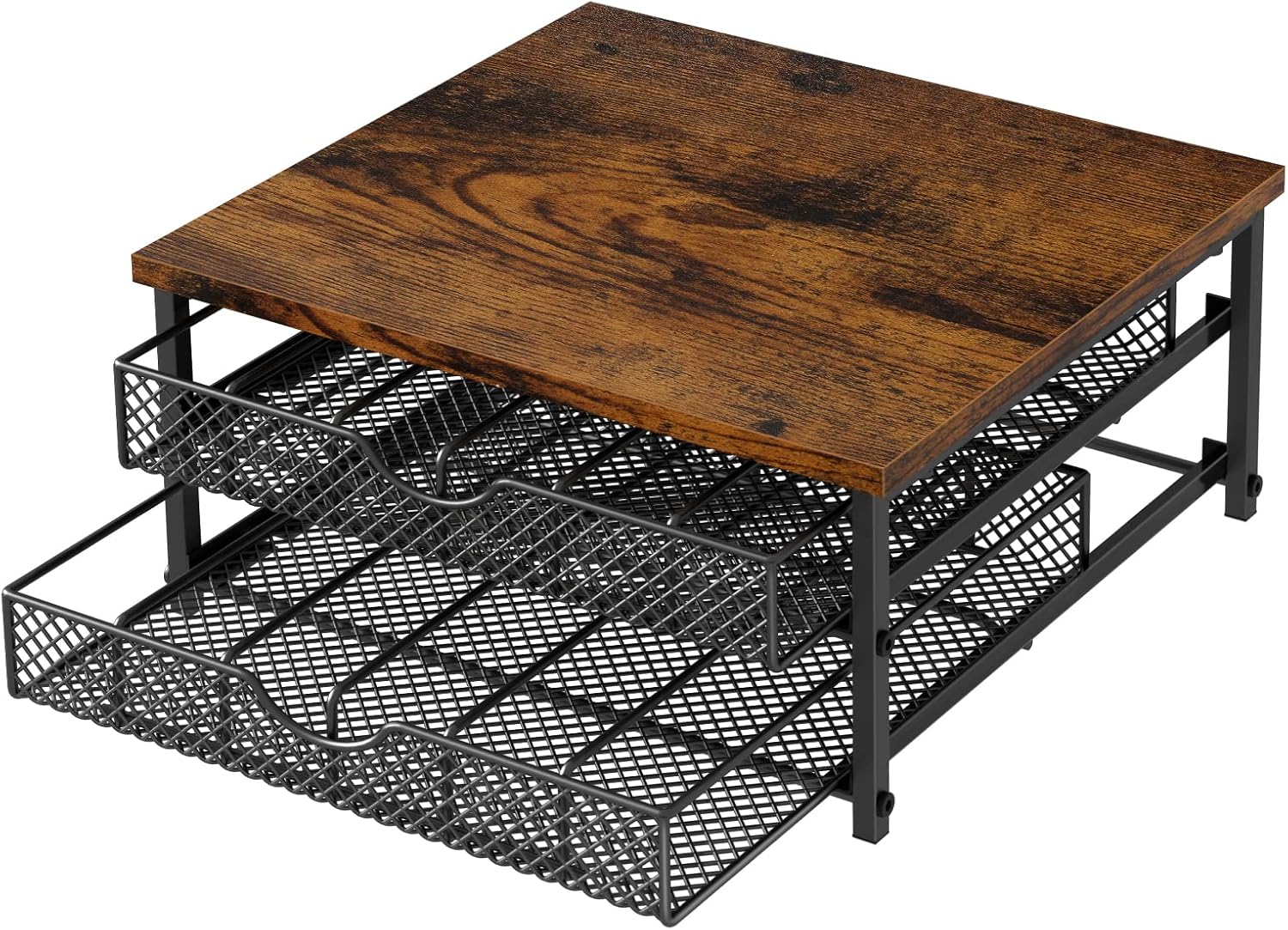 - Quality Materials: The pod storage drawer for k cups is made from a combination of solid metal and quality wood, sturdy and practical. The metal mesh basket keeps the aeration drying. The top wood board can place your coffee machine, is waterproof and easy to clean. It has excellent convenience and keeps your home clean and tidy.