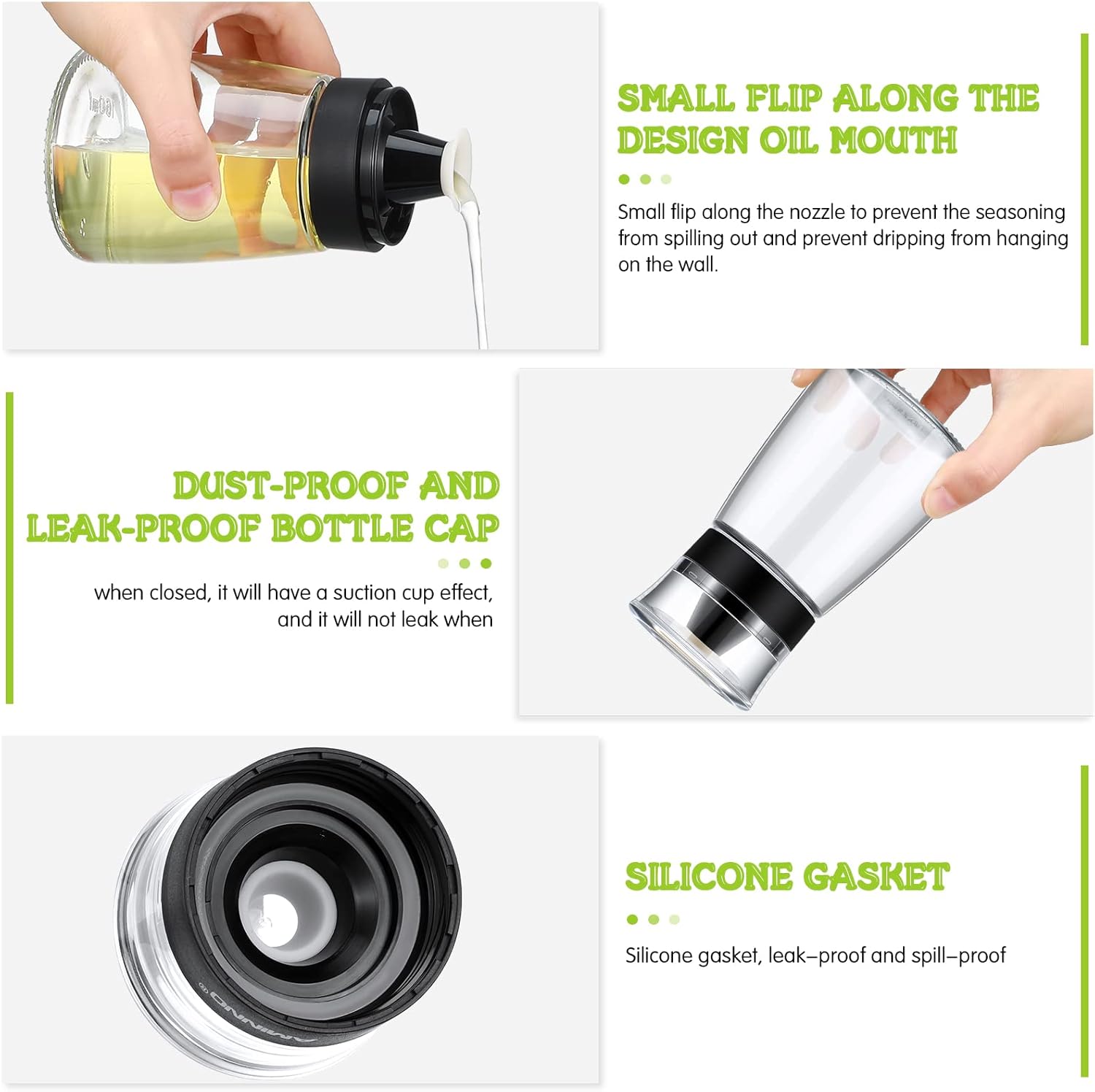 - Practical Leakproof Design: the top of the oil dispenser bottle is designed with a sealing silicone ring, when you put the lid on, these gaskets hold the top of the bottle so that they won't leak even if you inadvertently knock them over while you're cooking, keeping your table clean and tidy; There are small flips along the nozzle to avoid spillage of seasonings and prevent dripping from hanging on the wall