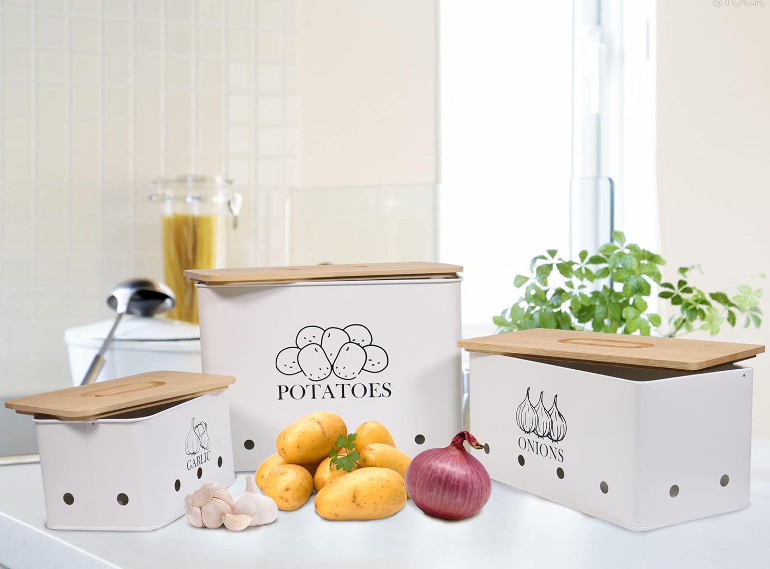 - 4.WIDE APPLICATION - Potato onion garlic canisters jars are perfect for any occasion, slow cooking, camping, picnics and other outdoor activities, Which can storage potato, onion, garlic, vegetables and fruit,etc.