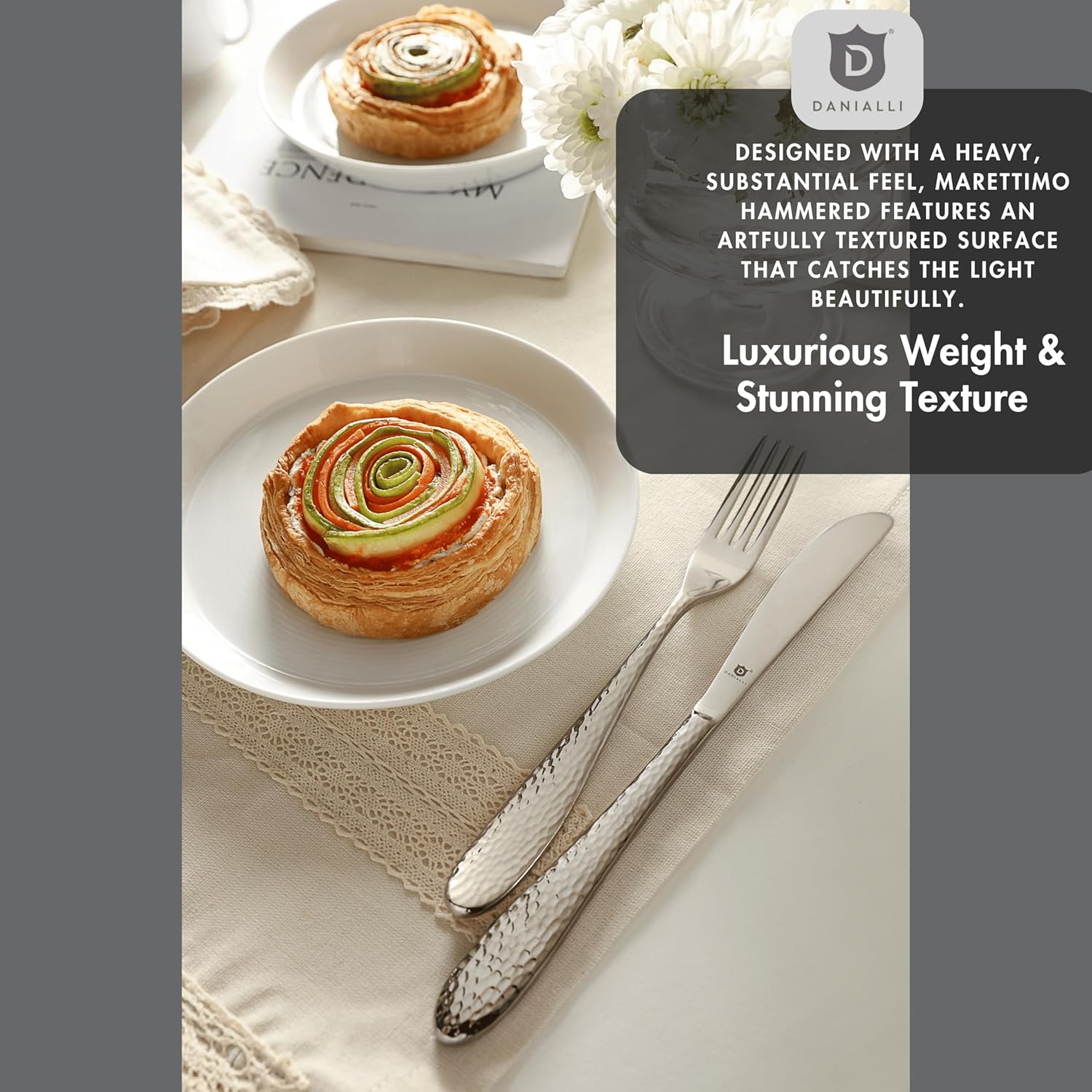 - The heaviest in DANIALLI's collection: Crafted with a hammered texture and heavy 18/10 stainless steel, each piece offers a solid well-balanced grip you’ll notice the moment you hold it.