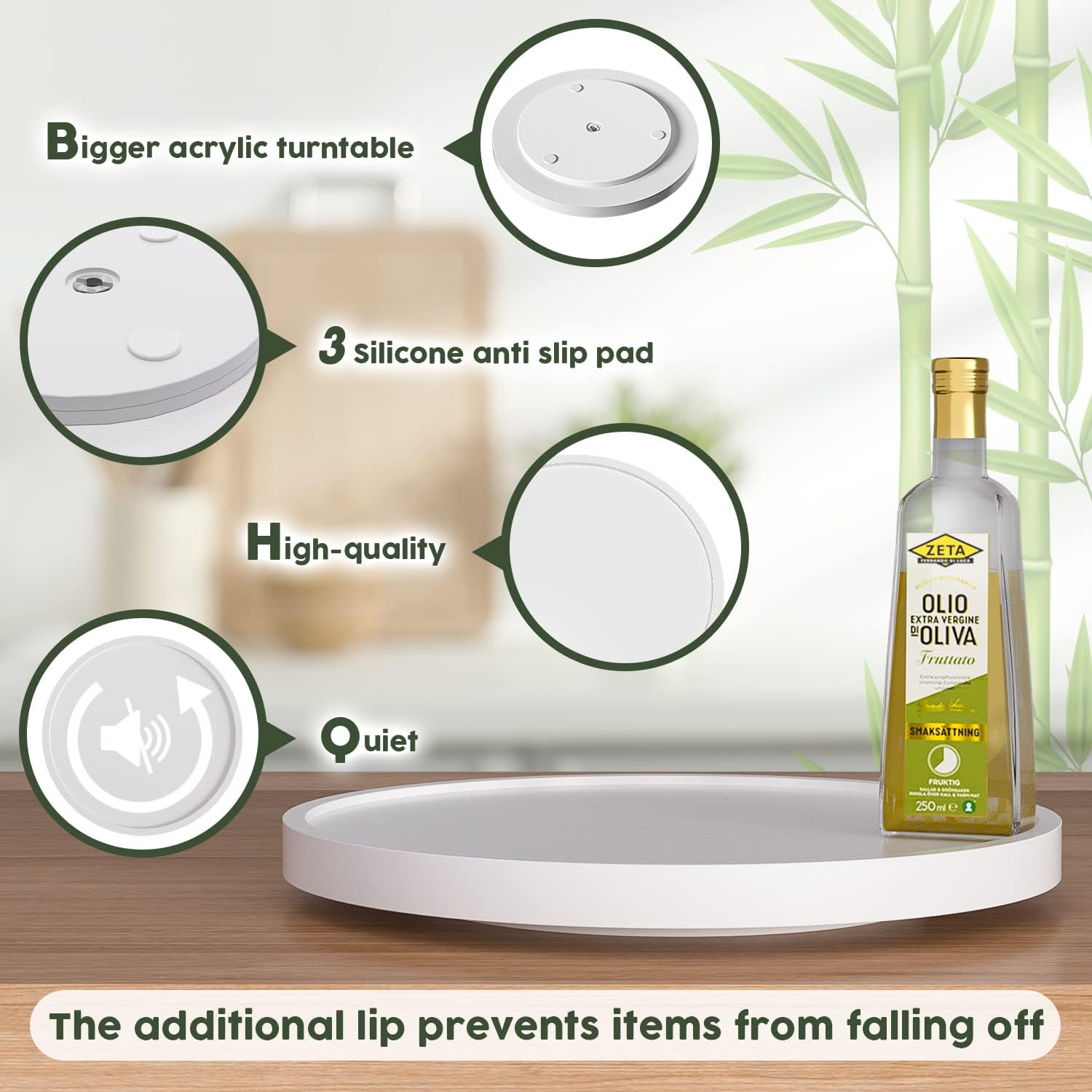 - Updated Design: Bigger acrylic turntable with 3 silica gel skid prevention pad makes lazy susan organizer rotate smoother and quieter. You can get any item from any angle. The additional lip prevents items from falling off