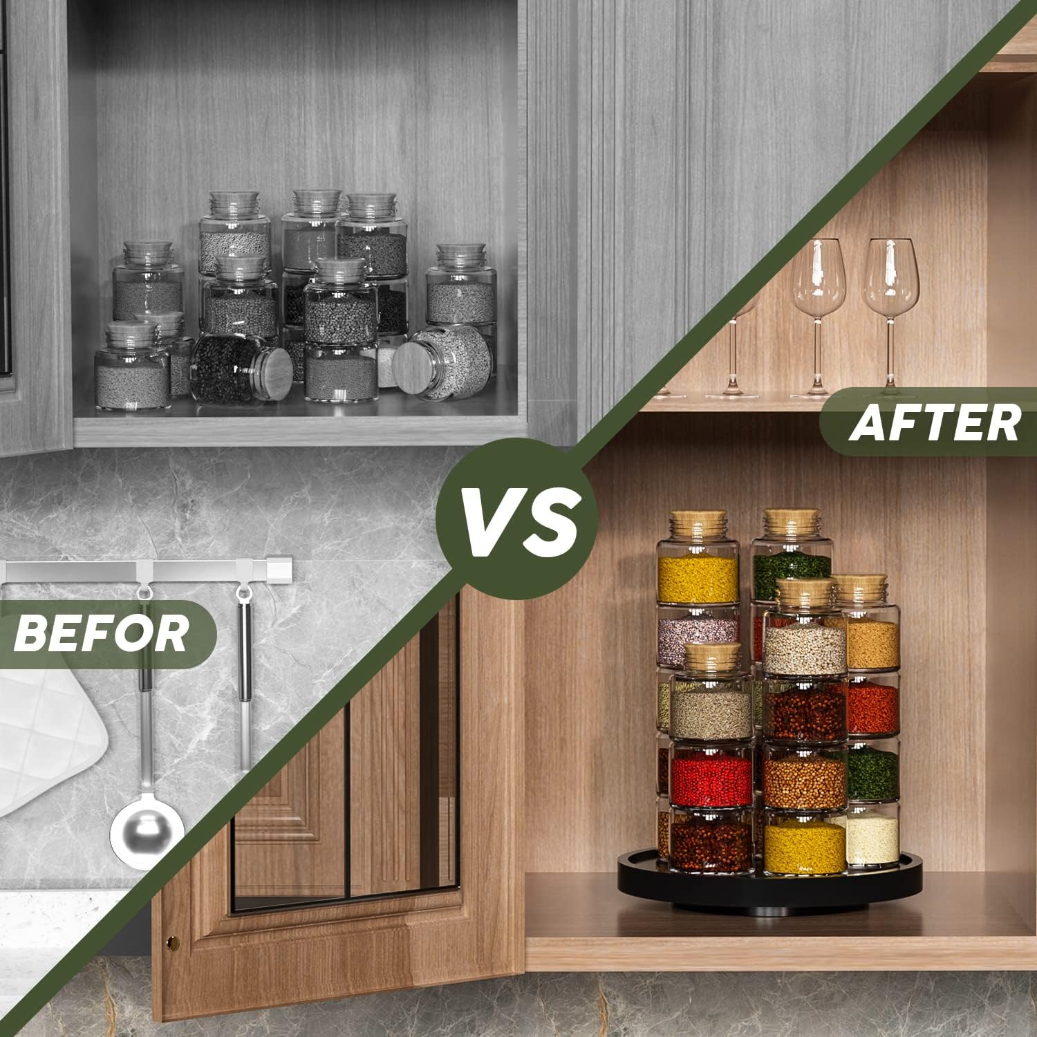 - Cooking assistant: lazy susan organizer perfect for organizing salt, vinegar, pepper, olive oil close to stove and easily reached; Center piece for table to hold napkin holder, honey, cinnamon, sugar and a vase; Helps keep table nice and organized