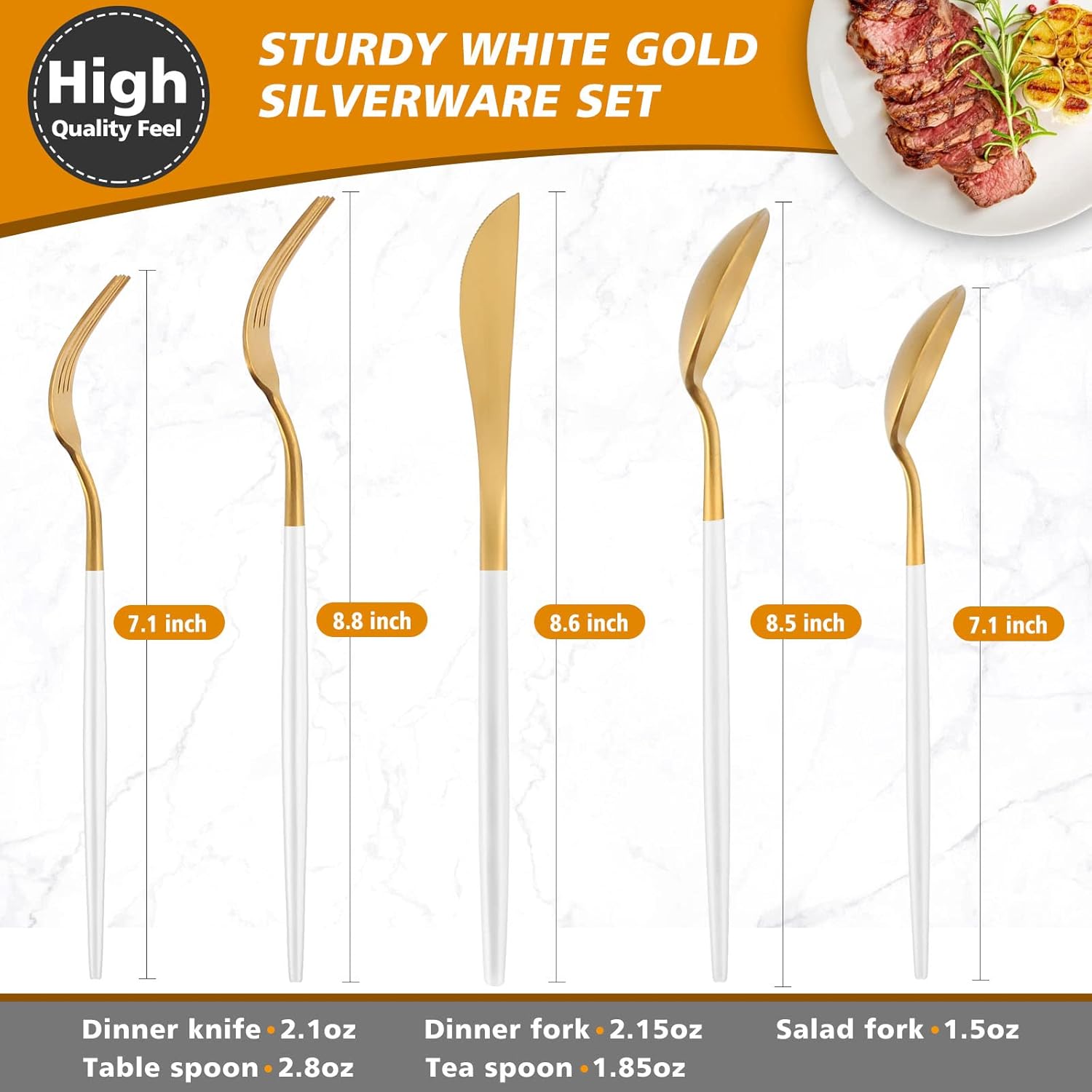 - DISHWASHER SAFE :This white gold silverware is easy to clean and dishwasher safe.Your good care can make the knives,forks and spoons silverware still look as same as new