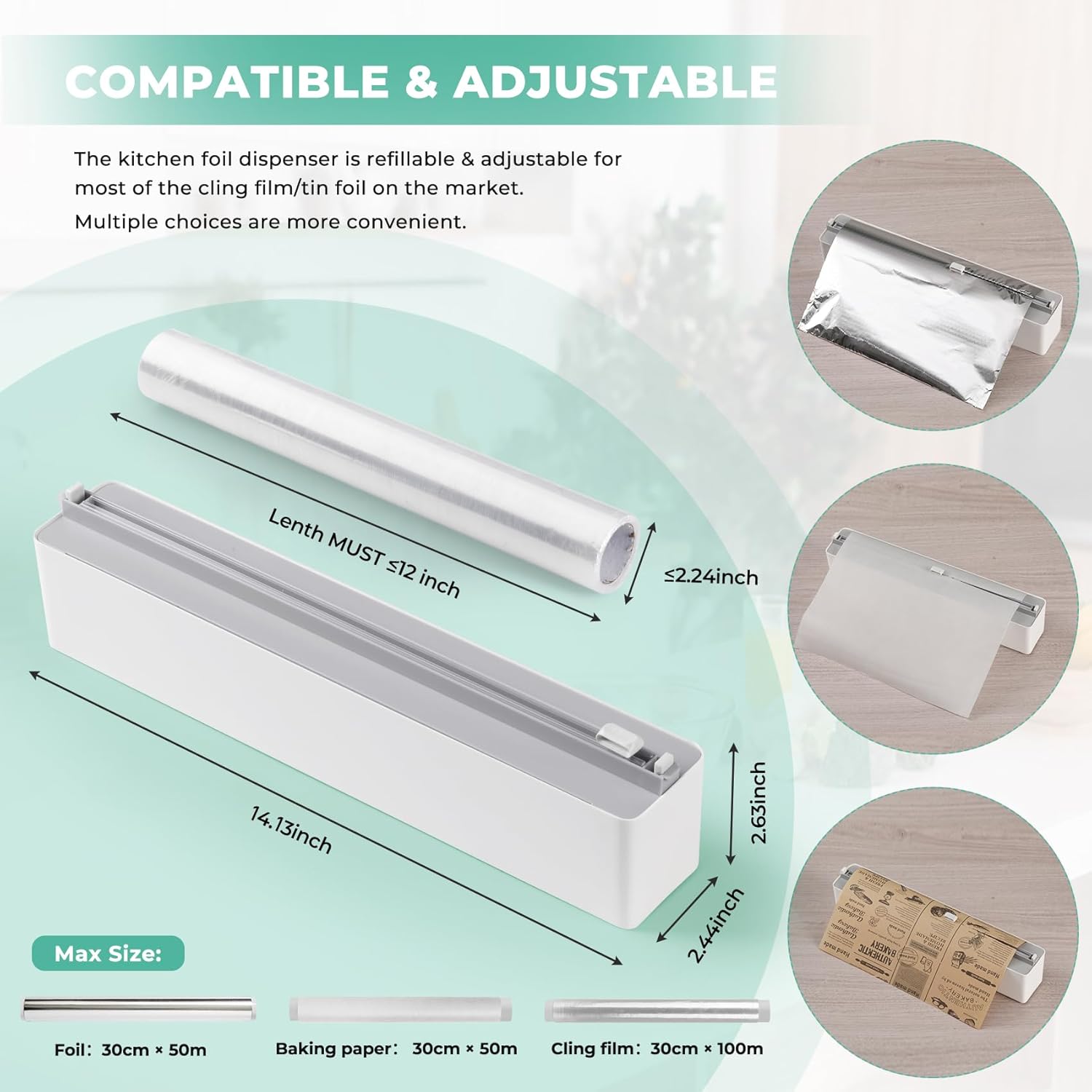 - UPGRADED CAPACITY: The aluminum foil dispenser is refillable & adjustable for most of the Cling film tin foil on the market. Max refill roll size: 12" X 490' (if rolls' inner diameter is 1.18 inch), the refills' outer diameter MUST≤2.24 inch and the length MUST≤12 inch. NOTE: Do not fit a larger roll of wrap, please check the size before purchasing.