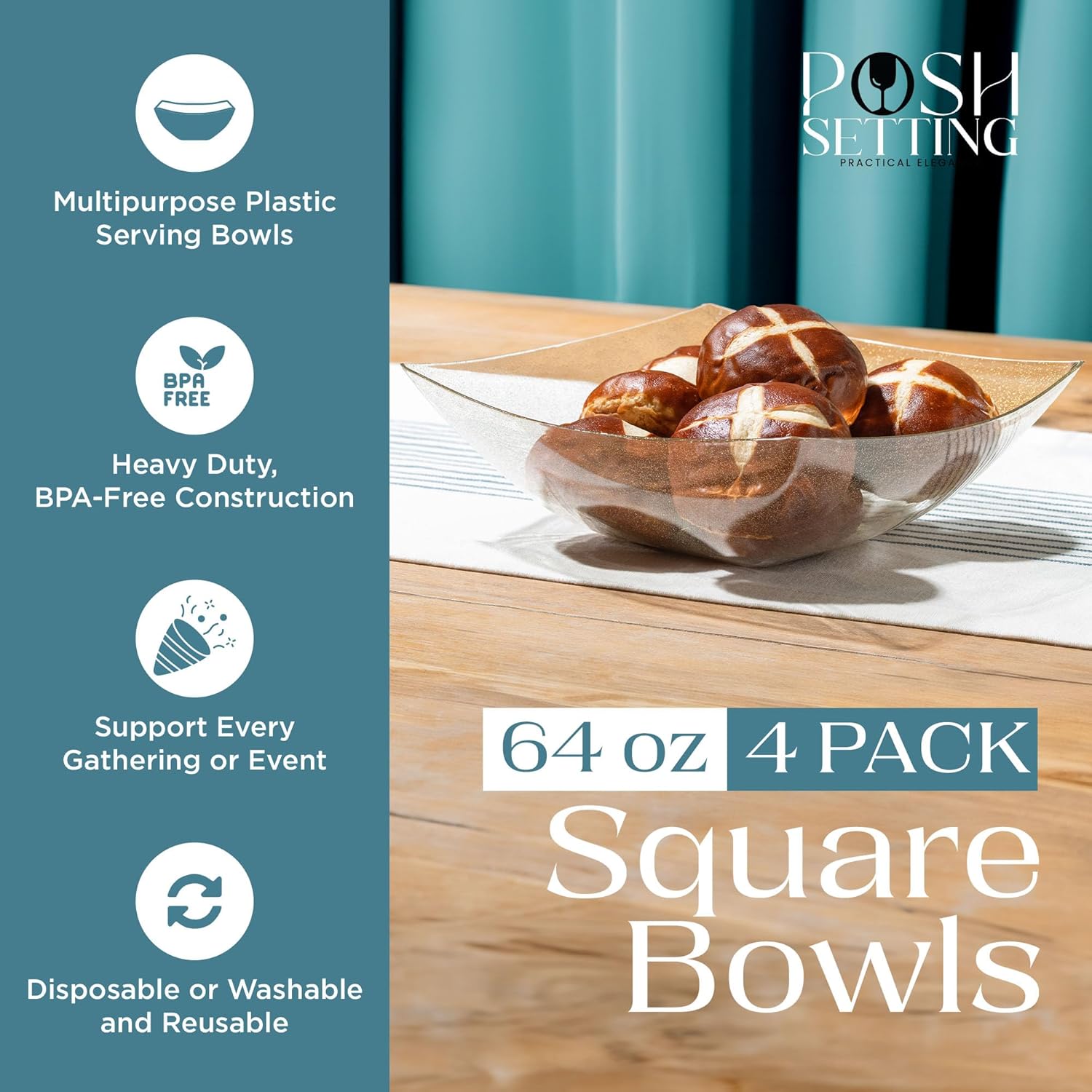 Posh Setting - Gold Glitter Plastic Serving Bowls for Party (64oz - 4 Pack) Square Bowls, Disposable Chip Bowls, Candy Bowls for Party Table, Salad Bowls for Party, Candy Containers for Candy Buffet