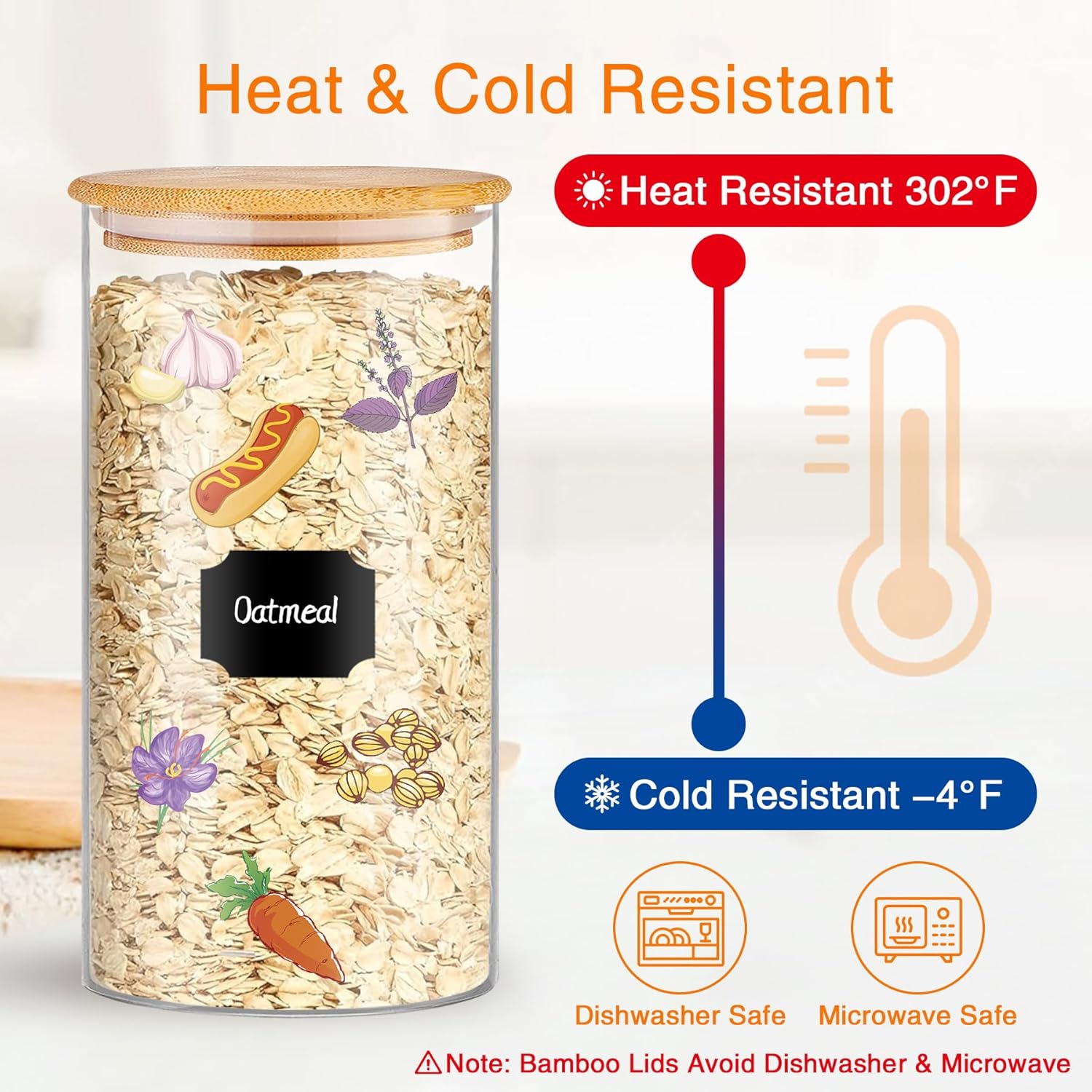 - 【Effortless Organization】Stay perfectly organized with 58 colorful labels included with these kitchen jars. The uniform airtight glass pantry storage containers set with bamboo lids stack neatly to maximize space - ideal for small kitchens storing flour, nuts or pet treats.