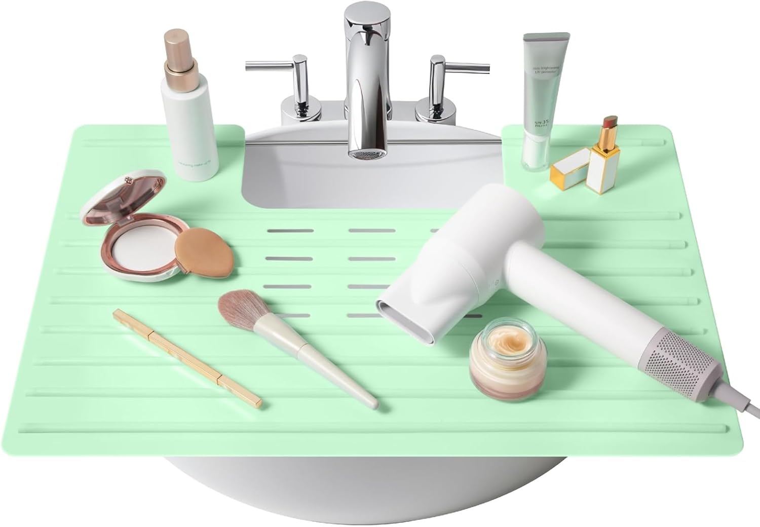 - Streamlined Morning Routine: Continue your daily activities with ease as this over the sink makeup holder allows simultaneous use of the faucet. Save time and maximize functionality with this innovative bathroom sink makeup mat