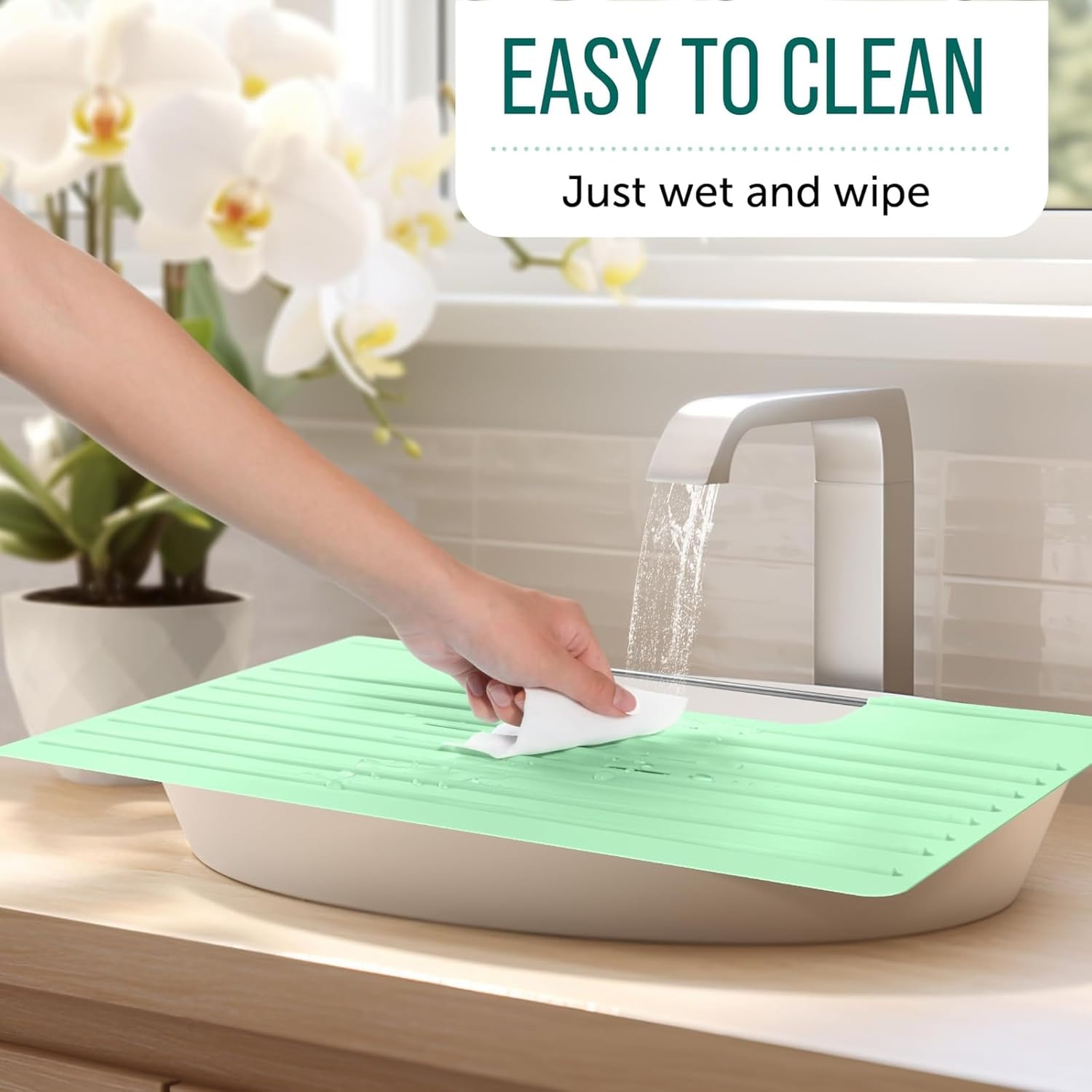 - Effortless Maintenance and Cleanliness: Maintain a pristine bathroom area by simply wiping the sink topper cover with warm soapy water. The around sink silicone counter protector effectively shields surfaces from makeup residue and spills