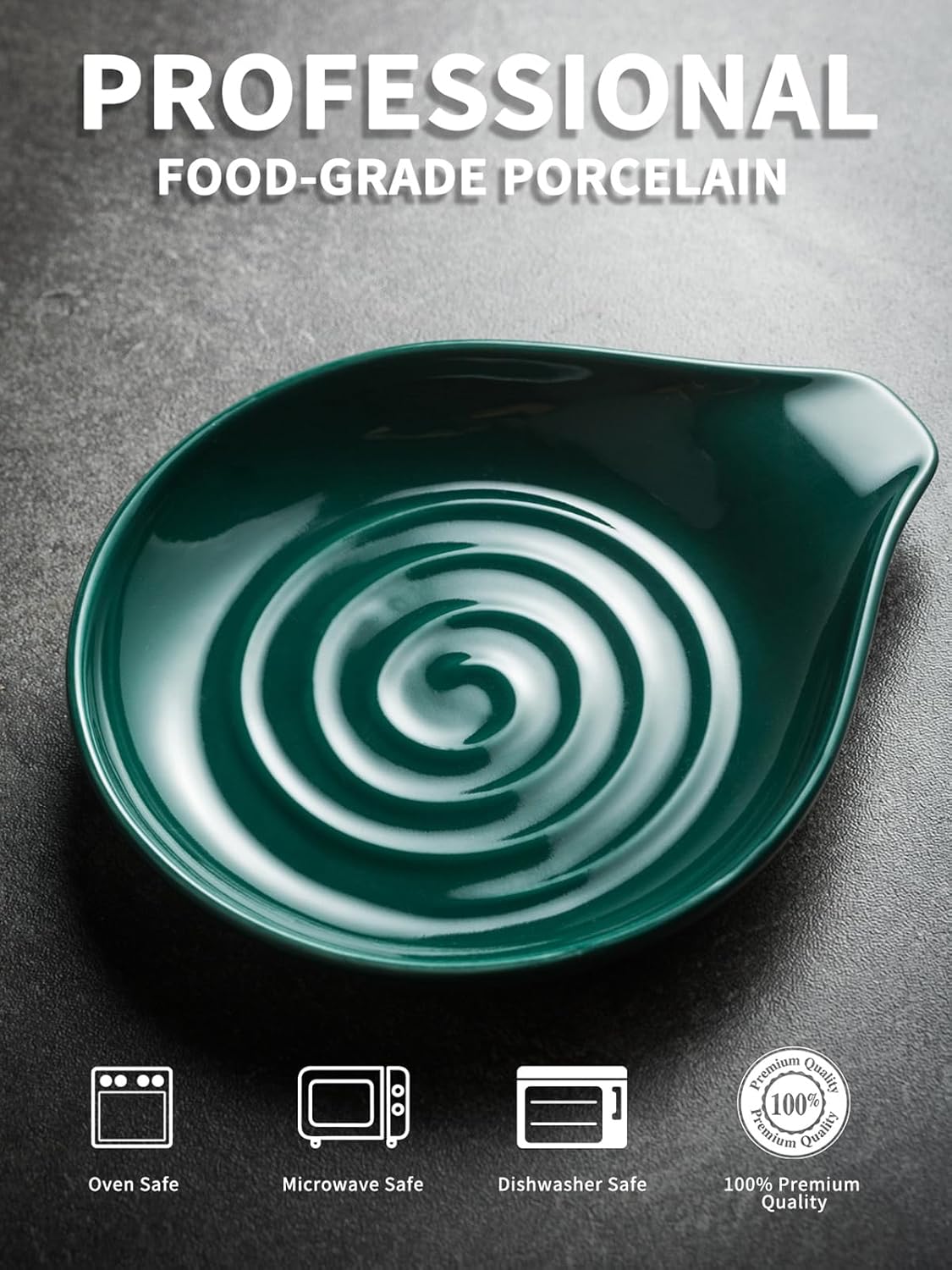 - Its swirl shape finish adds an eye-catching element to any kitchen countertop. Featuring a sturdy porcelain, this spoon rest is ready for heavy duty use at buffets, hotels, and home