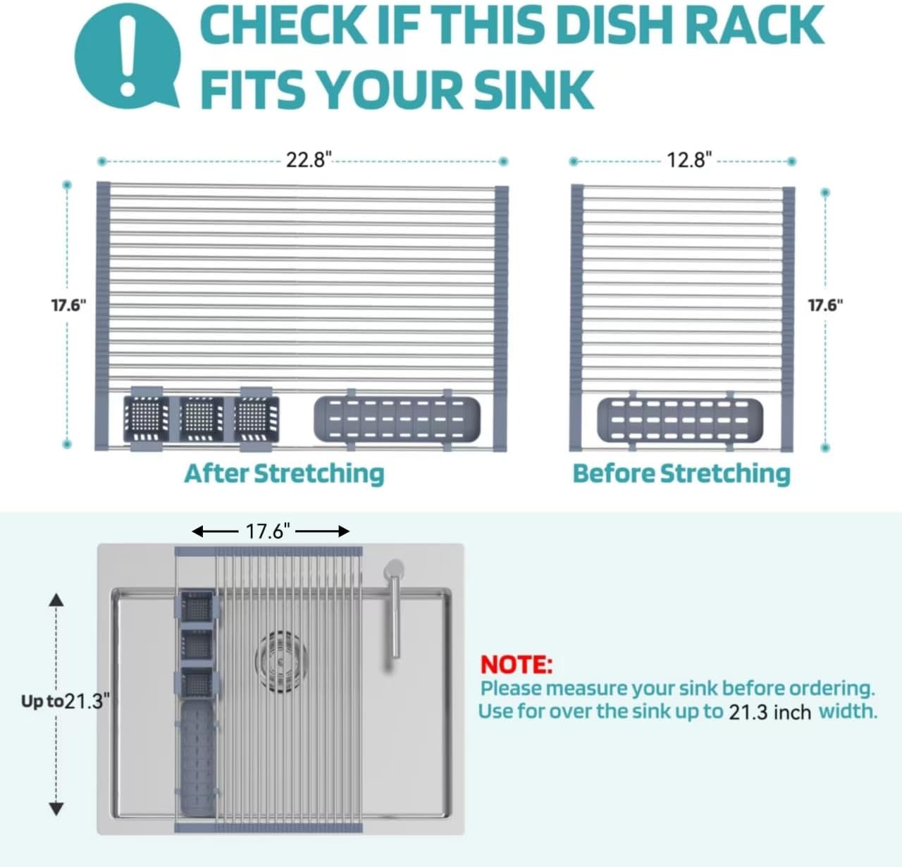 - 【PERFECT DESIGN】🎁 Giftable Package - Ready to go for gifting to your love ones 💝The length of the sink dish drying rack can be adjusted according to your needs,The dish drying rack size is adjustable 17.6"(length) x12.8"(width) -17.6"(length) x22.8"(width).The sink-type dish drying rack is suitable fo most sizes of sinks,and it is better to confirm the size of the sink before purchasing.it sinks with the shorter side does NOT exceed 21.3''(54cm)