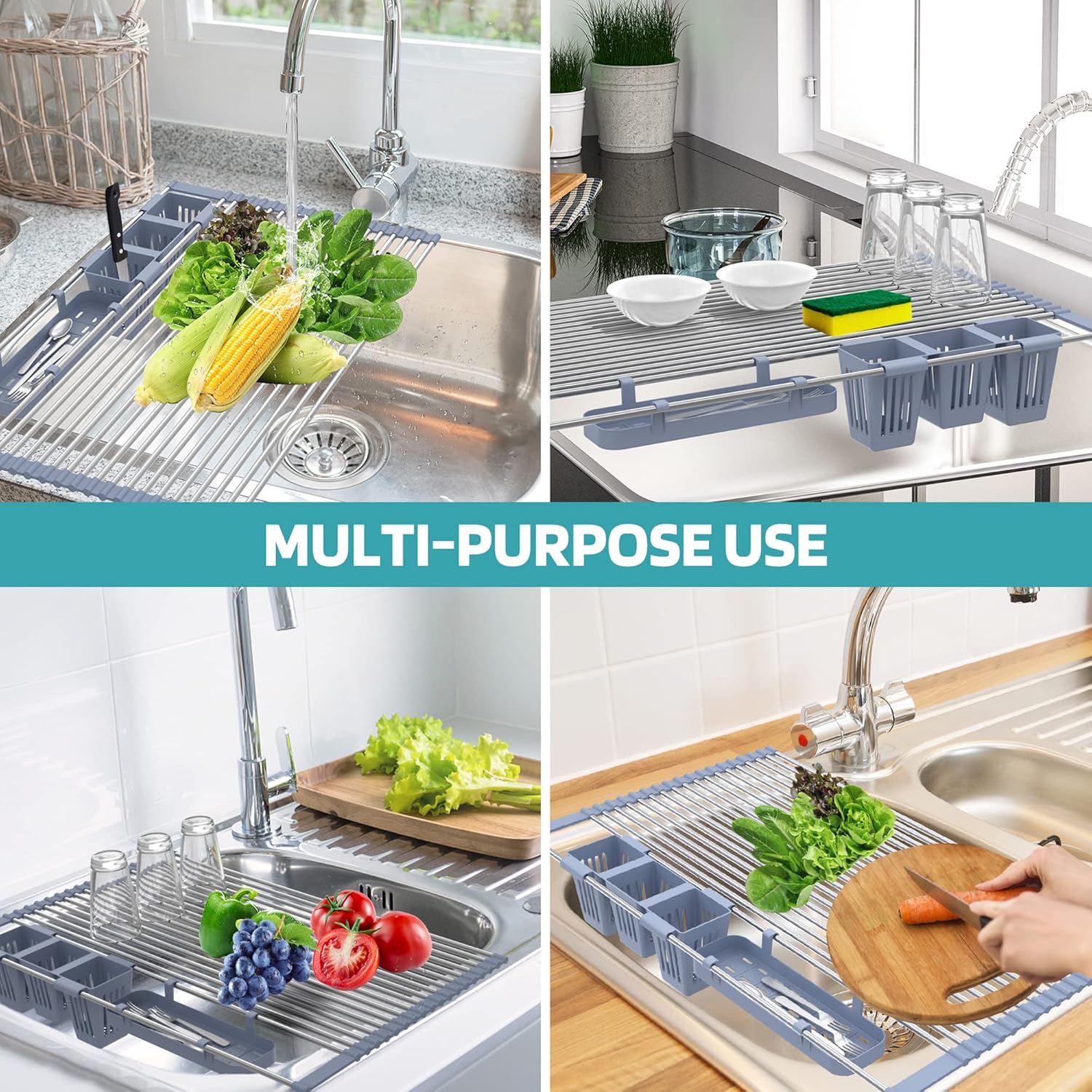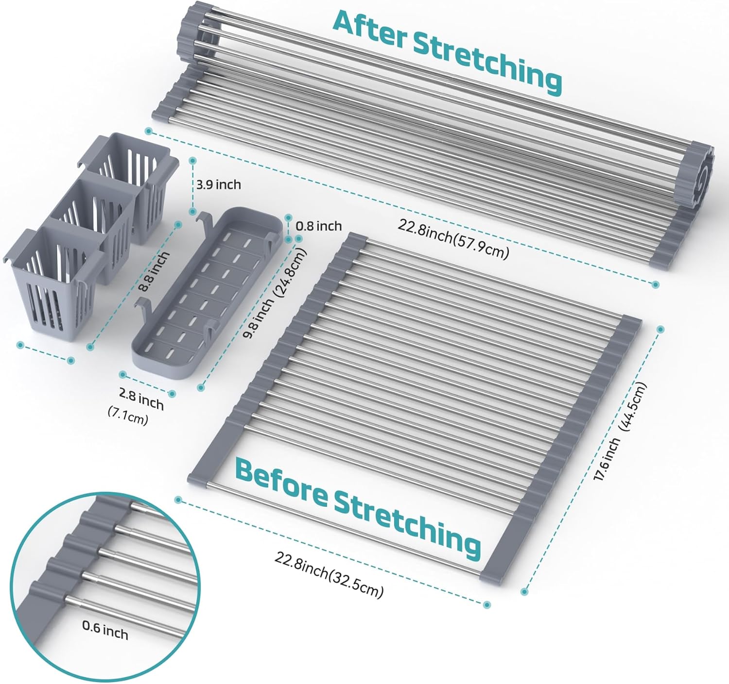 Extra Large Expandable Roll Up Dish Drying Rack Up to 22.8''with 2 Storage Baskets,Over The Sink Kitchen Rolling up Dish Drainer Dish Drying Rack in Sink, Foldable,Rollable,for Kitchen Dishes,Fruits