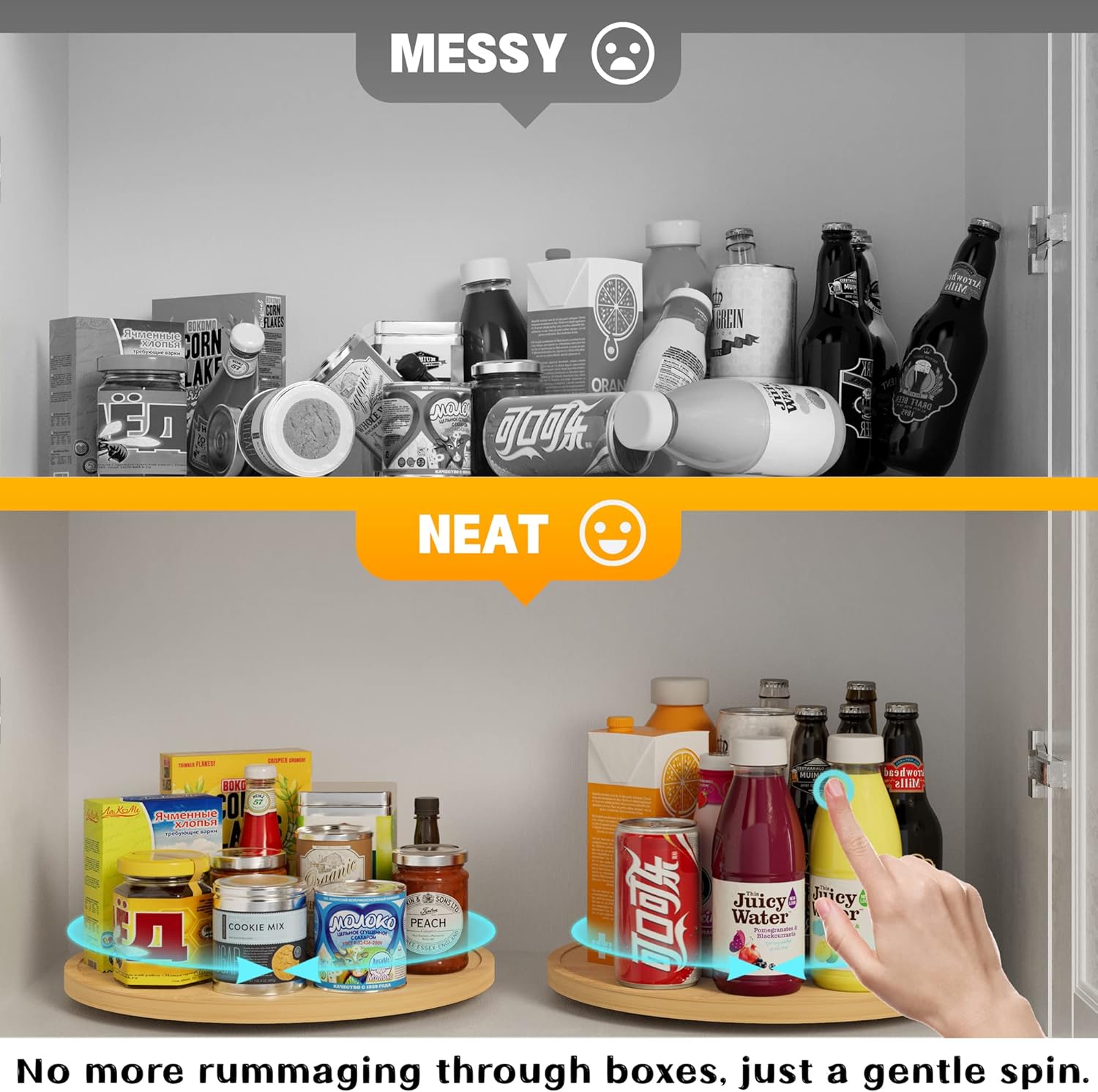 - ✔️【EASY TO REACH FROM ANY SIDE】This Lazy susan is 360-Degree turntable, which makes it ideal for cabinets or counters. Especially in corner cabinets and deep base cabinets where items can be hard to reach, always convenient to get things from upper shelves or corner cabinet just by a simple spin!