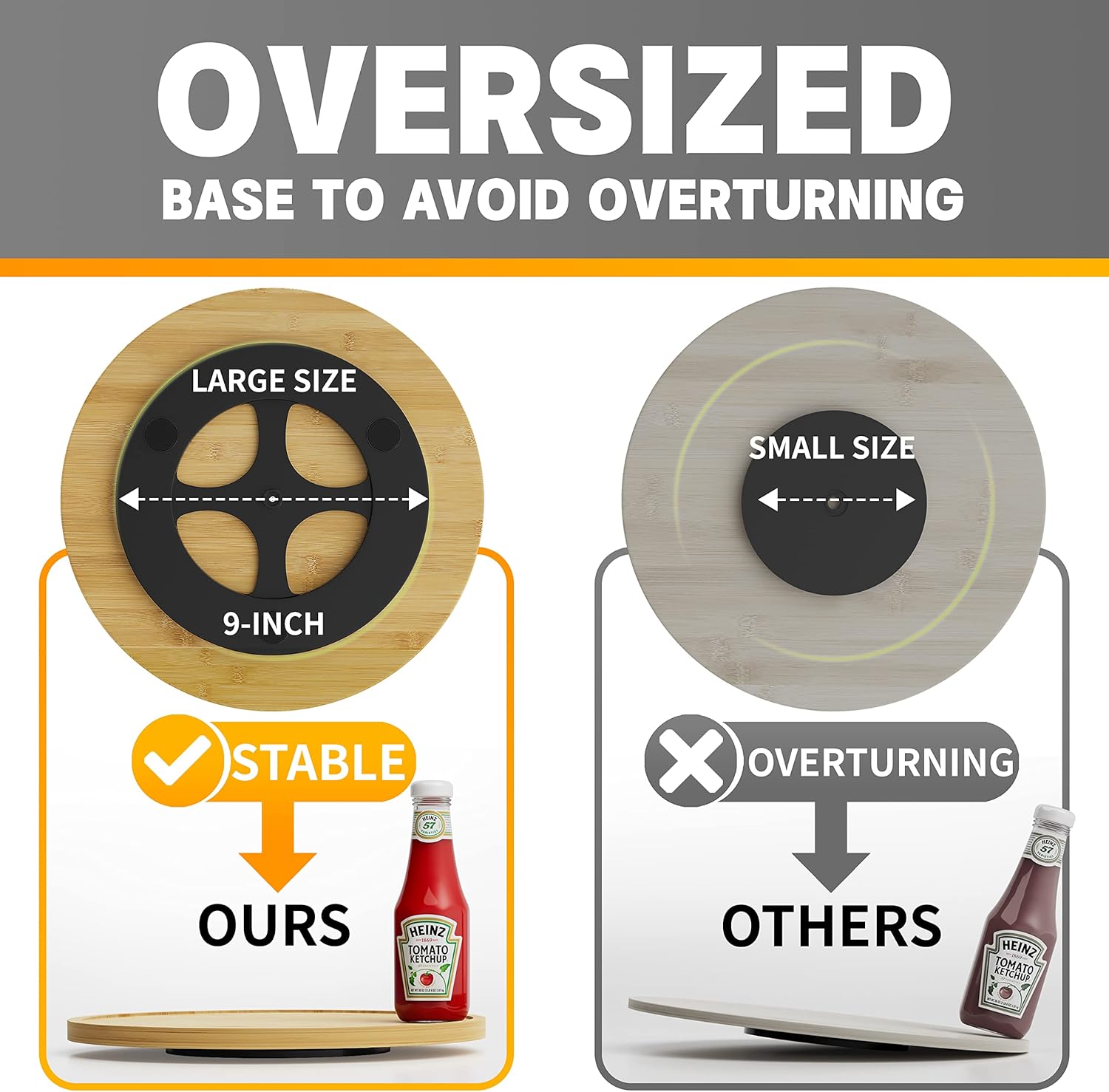 - ✔️【UPDATED DESIGN】Higher quality swivel base will enjoy the ultimate in comfort and convenience that a smooth and silent rotation will bring, compared to other products, our bottom swivel section (9") is larger to effectively prevent dumped items. Will not be like other lazy Susan, because of uneven gravity makes it difficult to rotate.
