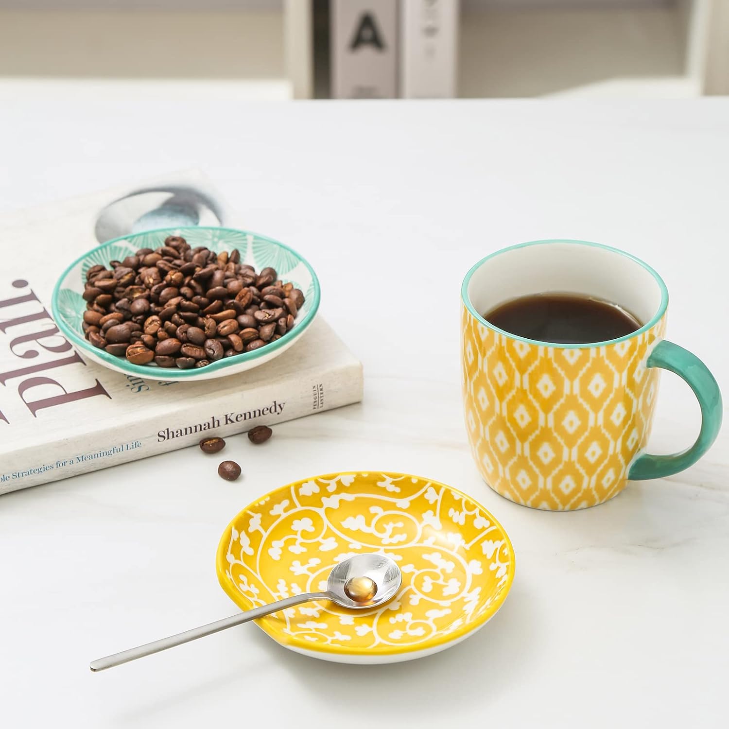 - PRACTICAL & DELICATE DESIGN - Each coffee spoon holder featured a circular depression design to keep the utensils in place. The slightly raised edge reduces the contact area with the table and collects all the water dripping from your cookware better. The assorted patterns decorated with vibrant colors can easily enlighten your dining table!