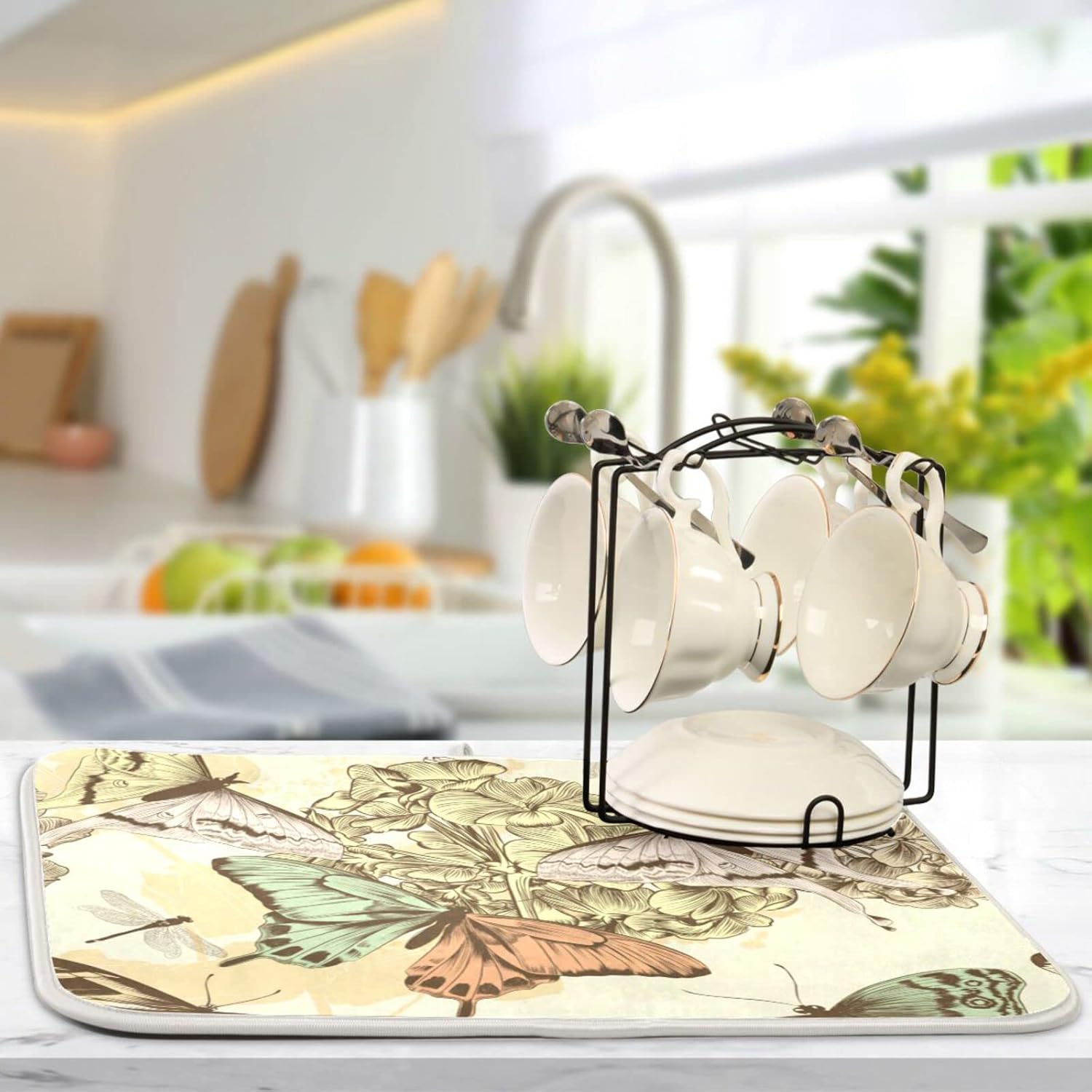 senya Super Absorbent Dish Drying Mat, Microfiber Fast-Drying 24'' x 18'', Kitchen Pad, Retro Butterfly