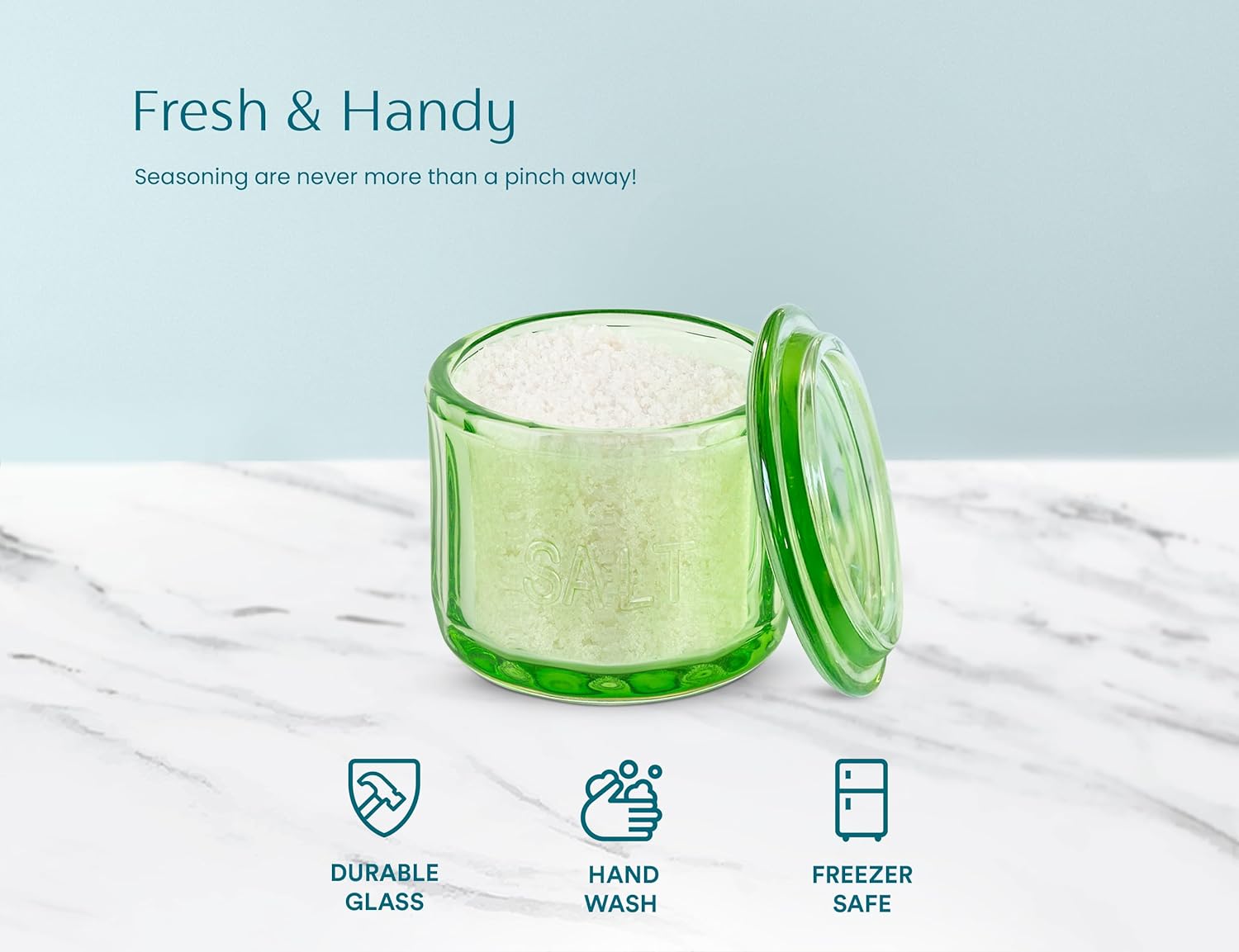 KooK Glass Salt Cellar, with Lid, Embossed Pressed Glass, Clear Storage Container, for Coffee, Sugar, Spices and Candies, 10 oz (Lime Green)