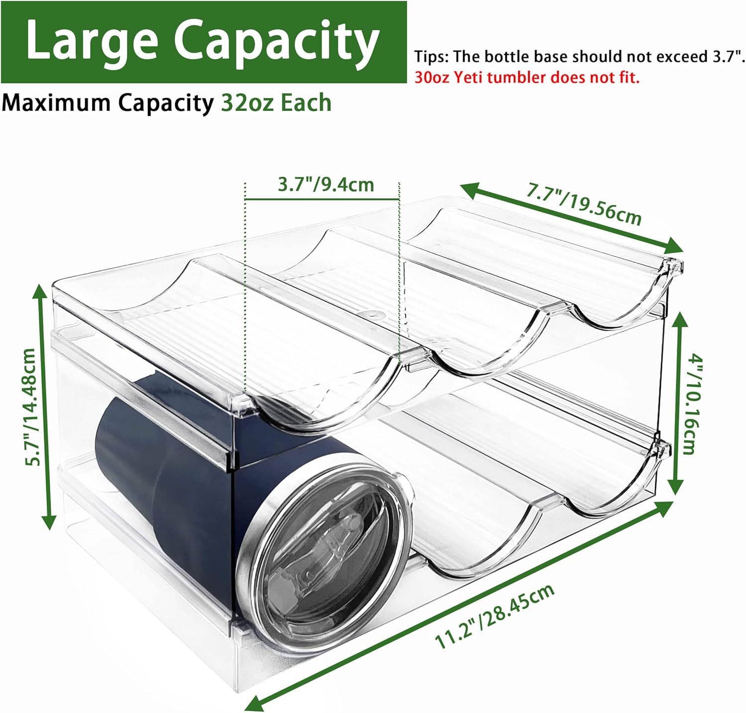 - PRACTICAL AND CONVENIENT: Cup storage organizer compatible with 12oz, 20oz, 26oz, 30oz, 32oz water bottles. No matter what type of water bottle, thermos water bottle, insulated tumbler, sports flask, travel mug, kids water bottle, baby water bottle can be used for storage. Also, this shelf you can use to store champagne, wine, soda, drinks and more (Tips: The bottle base should not exceed 3.7 inches. 30oz Yeti tumbler does not fit.)