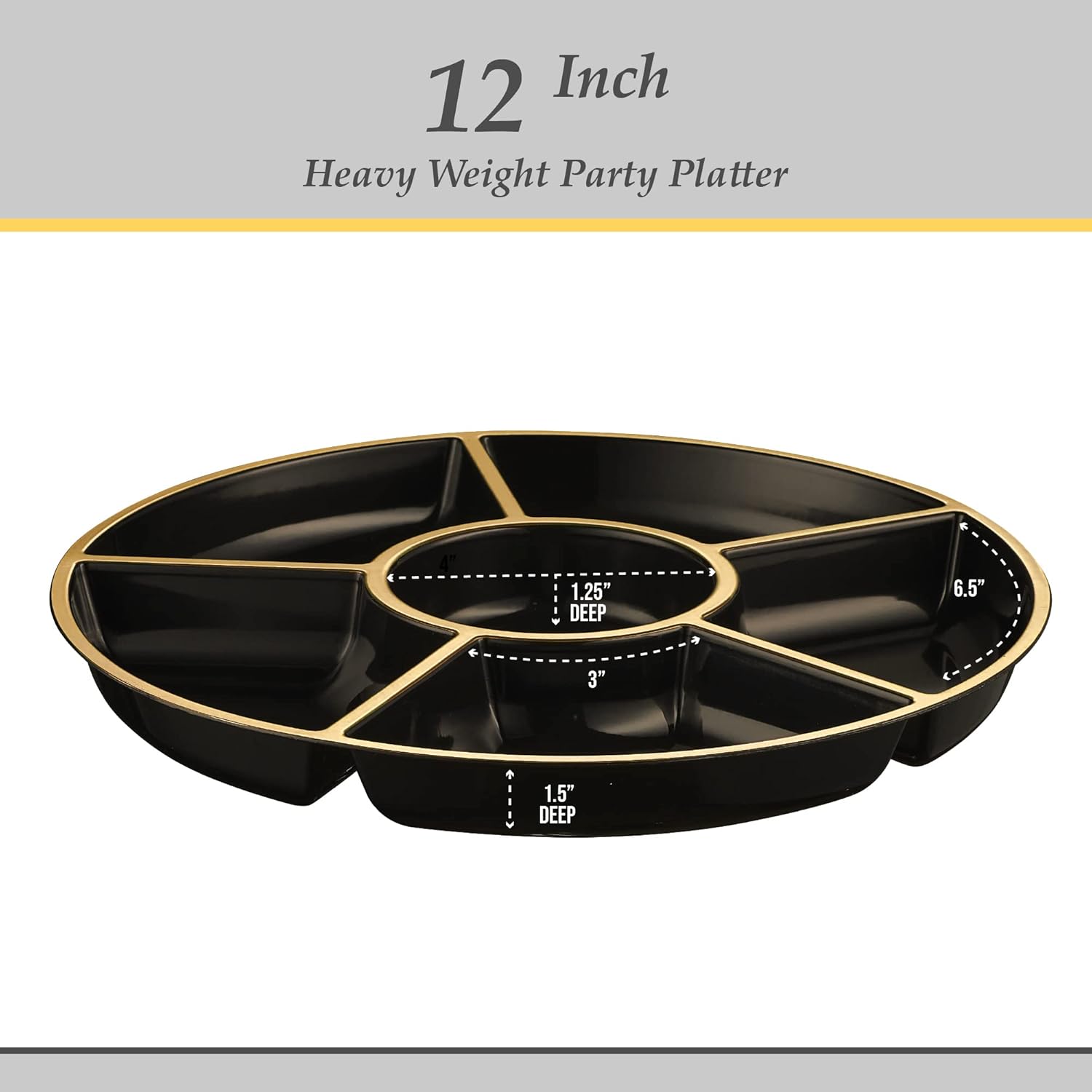 Plasticpro 6 Sectional Round Plastic Serving Tray/Platters Black & Gold Pack of 8