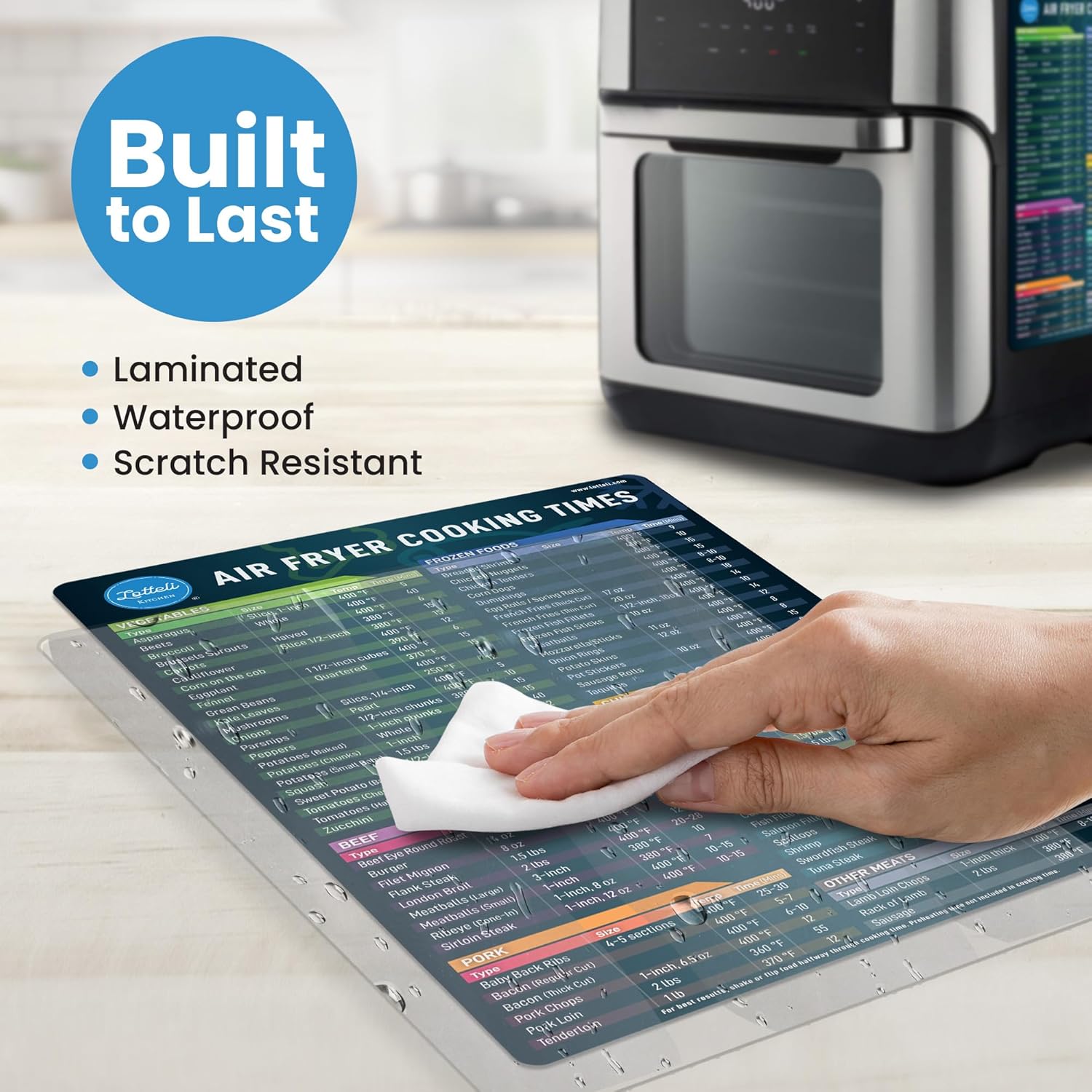 - EASY TO READ : BIG and CLEAR font along with the most popular foods is provided on the small magnet. Bonus, double-sided tape included, so you can stick these waterproof and oil-proof magnetic cheat sheets safely on your air fryer or cooker for always convenient access.