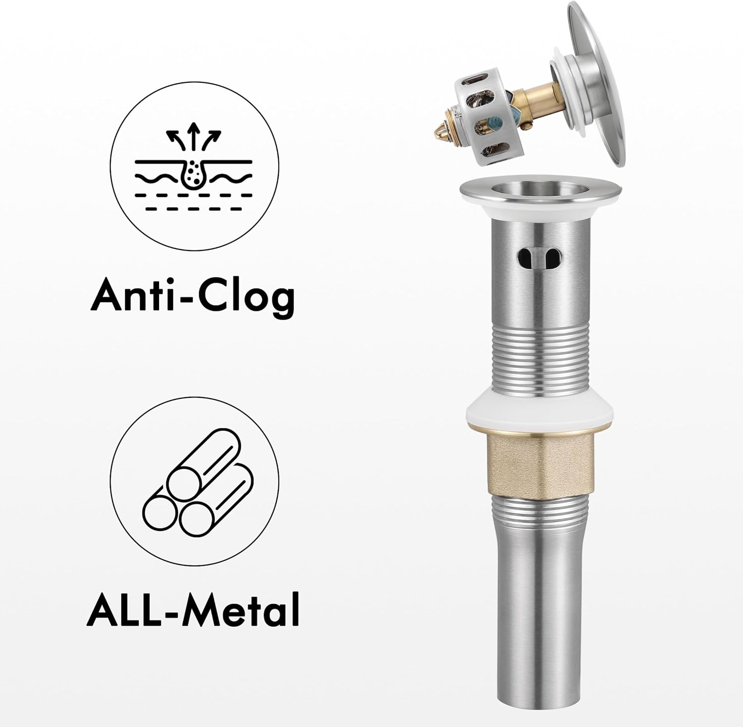 - [ ALL-Metal Pop Up Drain & Water Supply lines Included ] Including cUPC hoses and a sink stopper equipped with a premium metal anti-clog drain. No need to spend extra money on buying a better drain to replace the inferior plastic one.