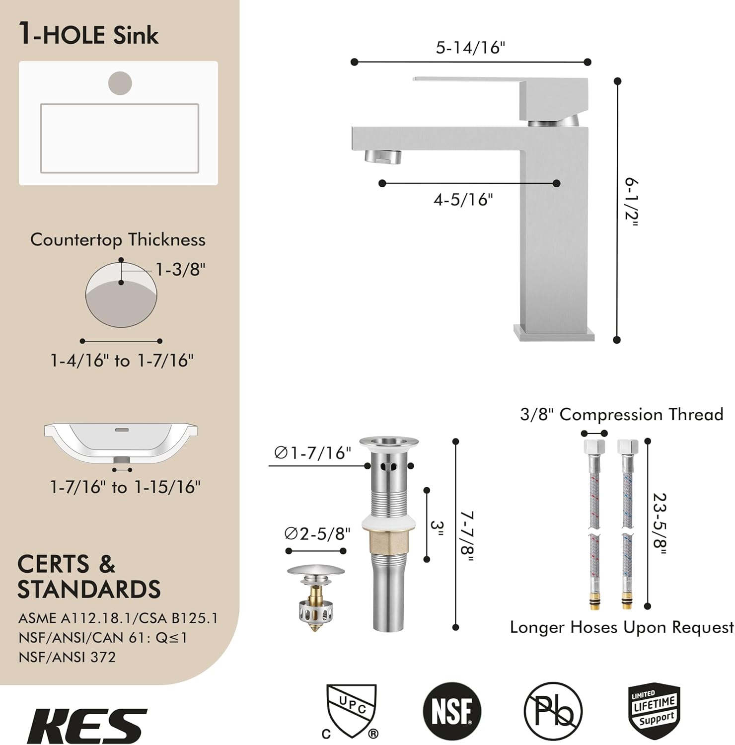- Included Components : 23.6" Resist-kink Hose (Covered Global Insurance), Bathroom Faucet (with NSF Lead-free Certified), Bathroom Sink Stopper (ALL Metal), Instruction Manual, Mounting Hardware (Fits U.S Standard) 23.6" Resist-kink Hose (Covered Global Insurance), Bathroom Faucet (with NSF Lead-free Certified), Bathroom Sink Stopper (ALL Metal), Instruction Manual, Mounting Hardware (Fits U.S Standard)