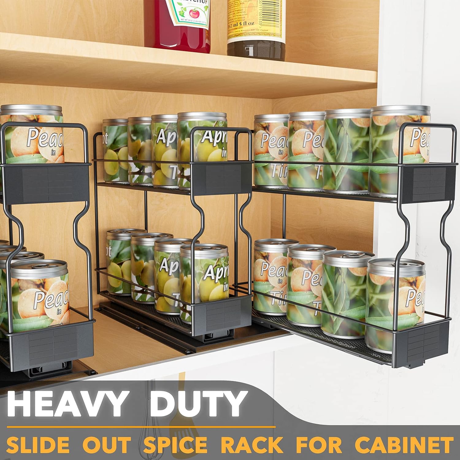 - HEAVY DUTY SPICE RACK FOR CABINET - Ball bearing glides ensure smooth sliding. Full extension glides offer you easy complete access to all spices inside the kitchen upper cabinets. Bottom panel is designed to clear any cabinet lip.