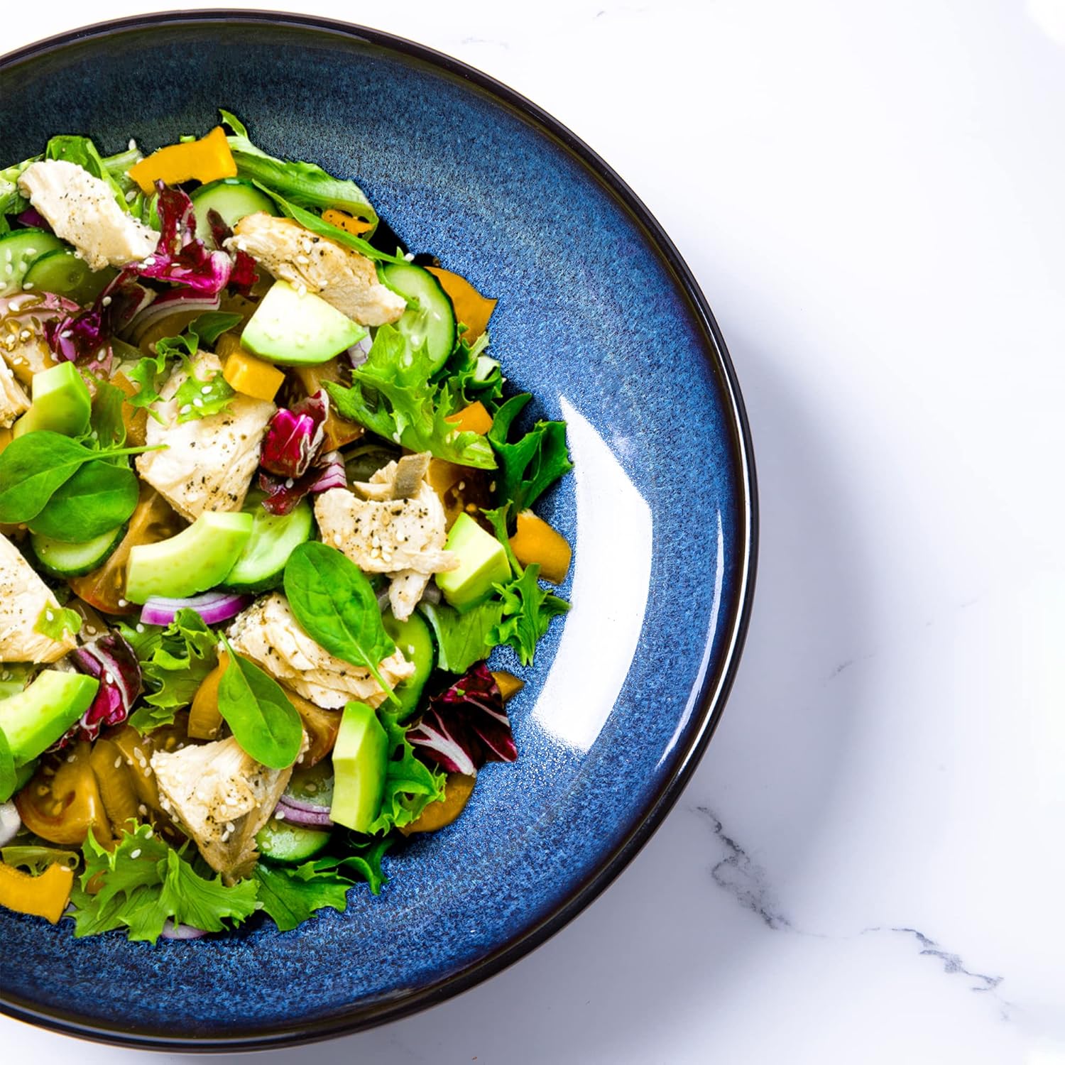 - 【UNIQUE AND SCRATCH RESISTANT】 Our bowls sets are fired with two different glazes,The reactive glaze make every plate is unique,Since our glaze is all-natural reactive finish, the surface of plates would change color on lighting,So Our glaze is also extra strong to prevent scratches from your knives and forks.