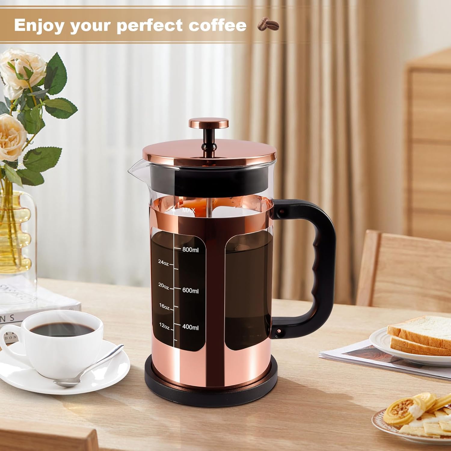 - 【Classic stylish design】Our french press coffee maker is classic rose gold design, noble, refined and elegant, best gift for family and friends