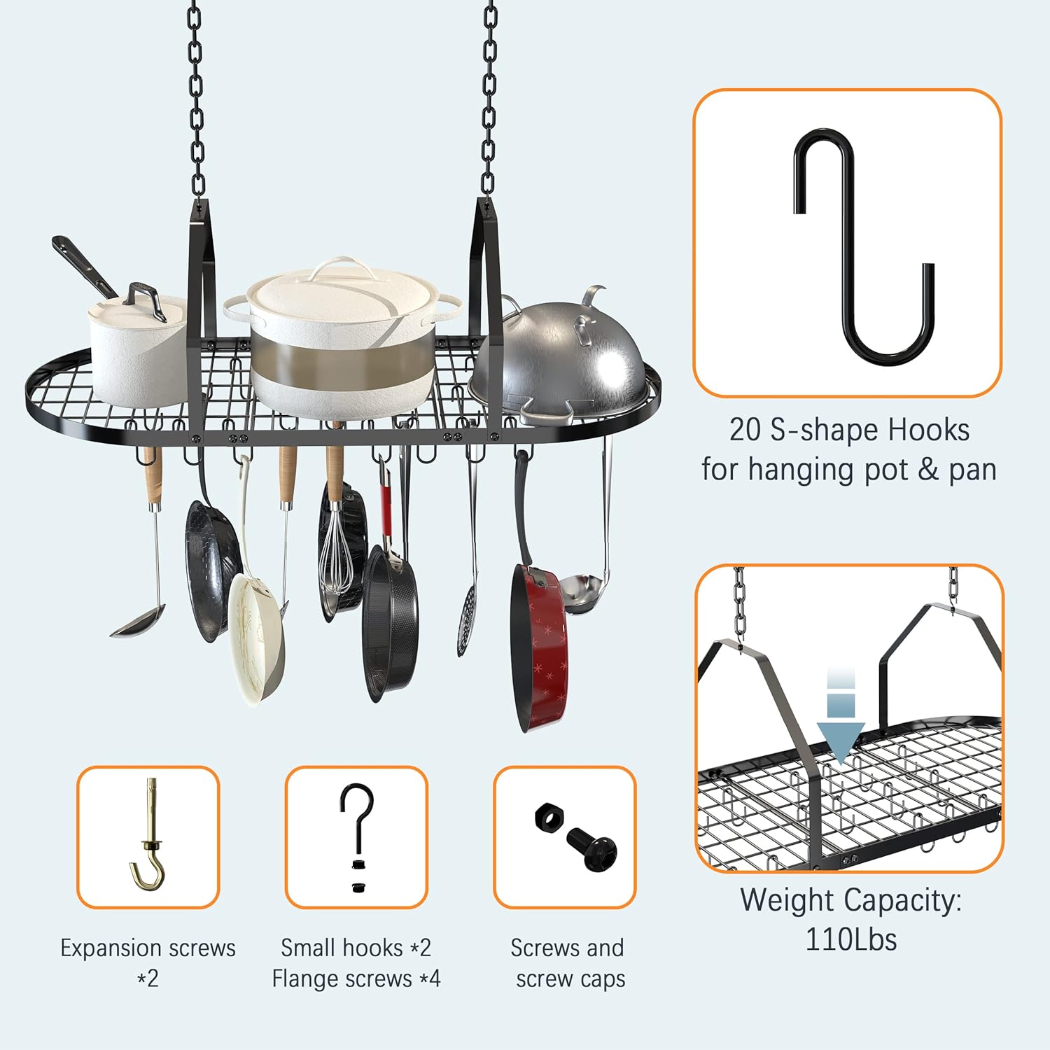 - 【Sturdy and durable】The thickness of the pot rack and the toughness of the chain suspension can easily withstand the weight of 110 lbs. 20 removable hooks can hold all pans or other utensils for daily use.