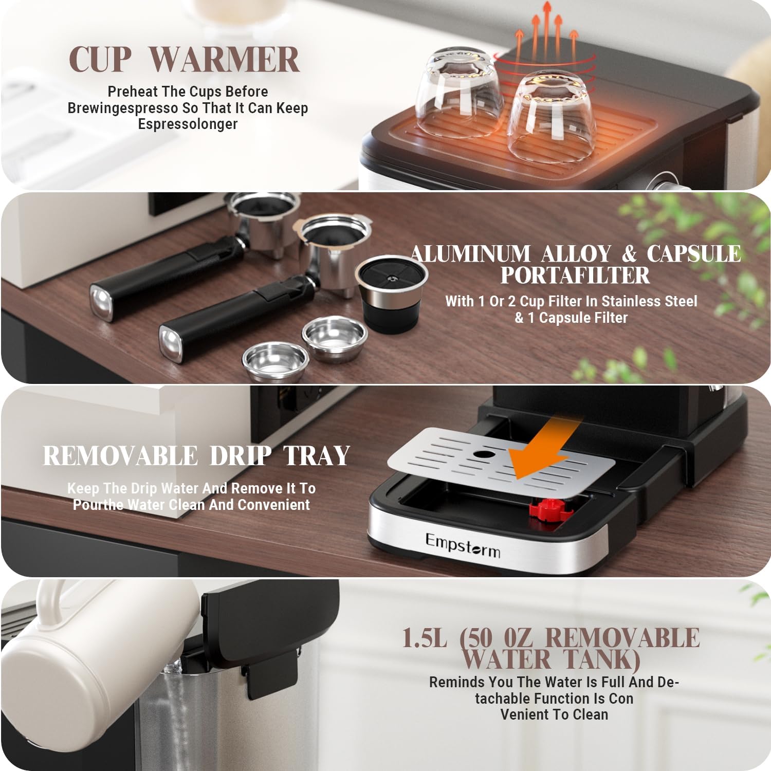 - 𝐈𝐍𝐓𝐔𝐈𝐓𝐈𝐕𝐄 𝐒𝐀𝐅𝐄𝐓𝐘 & 𝐄𝐅𝐅𝐎𝐑𝐓𝐋𝐄𝐒𝐒 𝐌𝐀𝐈𝐍𝐓𝐄𝐍𝐀𝐍𝐂𝐄:Never compromise on safety or convenience. The 1500CC Removable Water Tank pairs with Automatic Water Shortage Detection – signaled by bright white button lights – to prevent dry-heating. Extract coffee mess-free thanks to the Removable Drip Tray and spill-proof design. Bonus: The Warm Cup Area atop this espresso machine with milk frother preheats mugs to café-standard temperatures