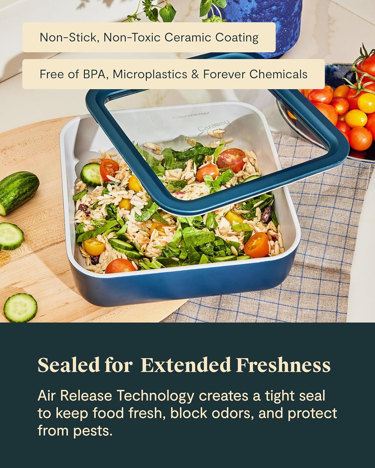 - KEEP YOUR FOOD FRESH: Look forward to leftovers with Caraway’s easy-to-store, non-toxic food storage containers. This 10 cup glass container was designed to be displayed and keeps your food fresh & organized.