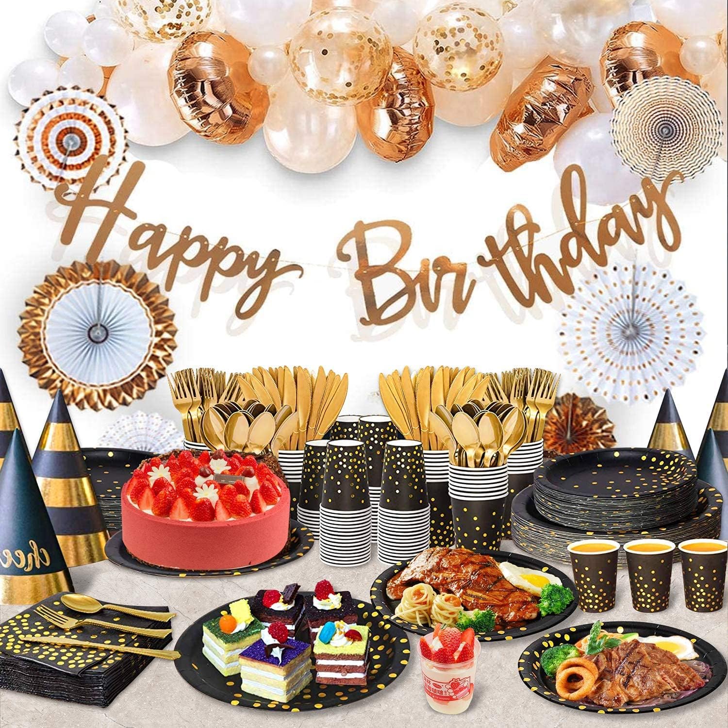 - ✔「High Quality & Elegant Festive Design」:This party supplies pack is designed with black background and gold foil polka dot pattern, Bring a high-end and elegant atmosphere to your party. All the products are made of BPA Free, non-toxic and tasteless 100% food-grade paper and plastic. The plates are high load-bearing, the knives, forks, and spoons will not bend, break. Bright color, high-grade feeling.
