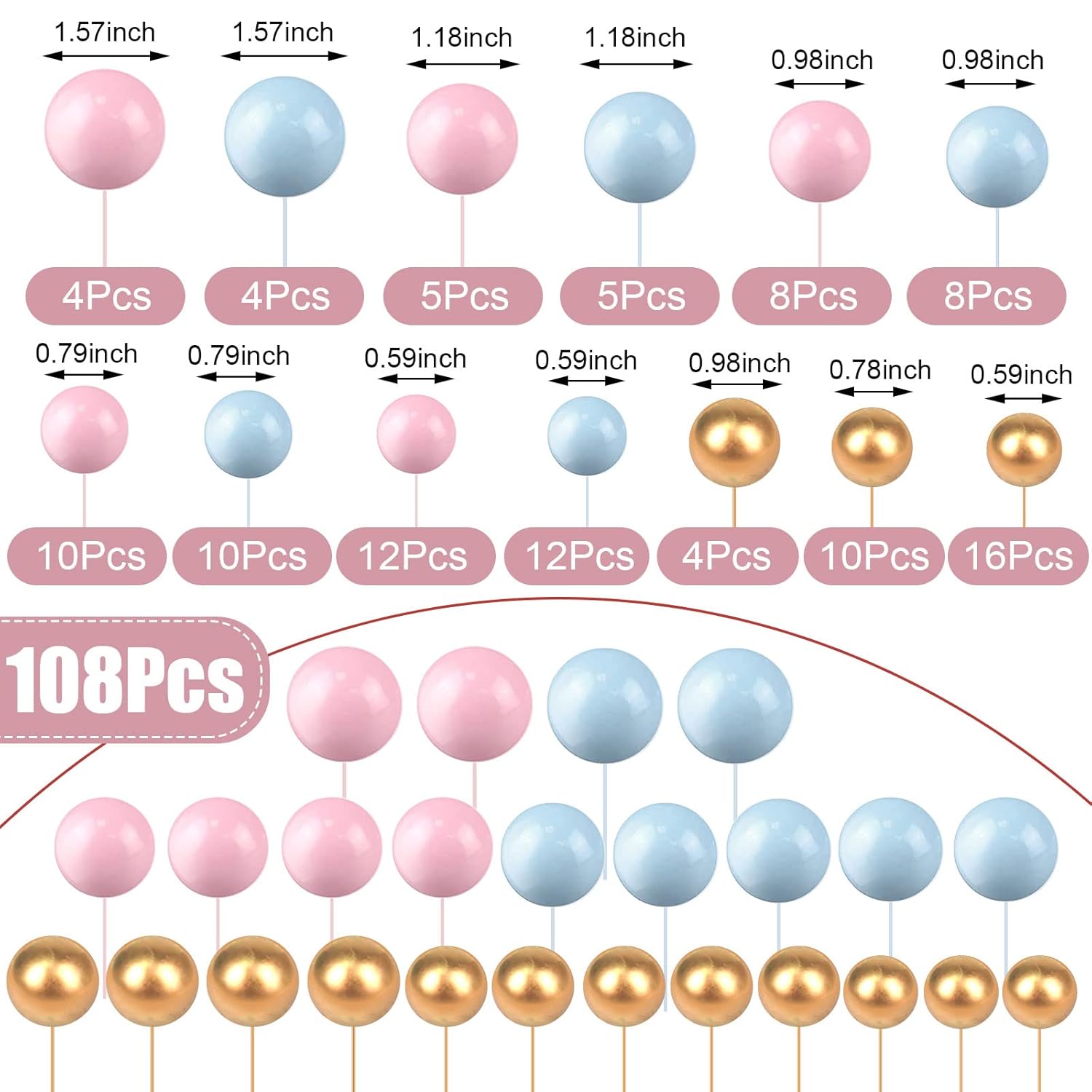 108 Pcs Balls Cake Topper DIY Cupcake Insert Foam Balloons for Cake Baking Wedding Anniversary Birthday Decoration(Pink, Blue, Gold,Multi Sizes)