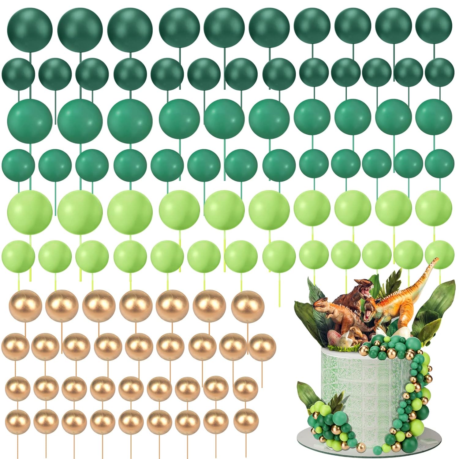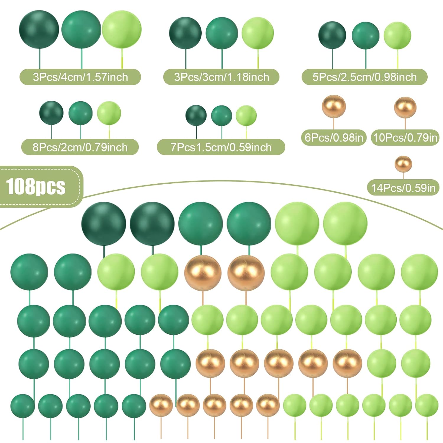 108 Pcs Balls Cake Topper DIY Cupcake Insert Foam Balloons for Cake Baking Wedding Anniversary Birthday Decoration(Assorted Green, Gold,Multi Sizes)