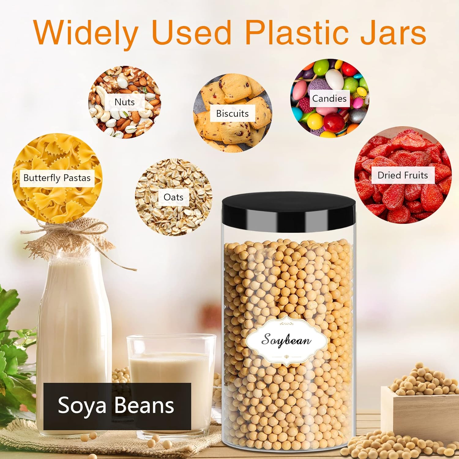 - Multipurpose Clear Round Jars: Our plastic storage jars with lids could be applied for different kinds of kitchen items, such as candies, sugar, coffee, flour, spices, tea leaves, biscuits, snacks, cookies, rice, beans, nuts, dried fruits, honey, grains, etc., These 32 oz clear empty jars are also great for playroom, garage and bathroom use. Put these plastic jars containers on the cabinets or shelves to make your home more tidy and organized with our plastic jars with lids