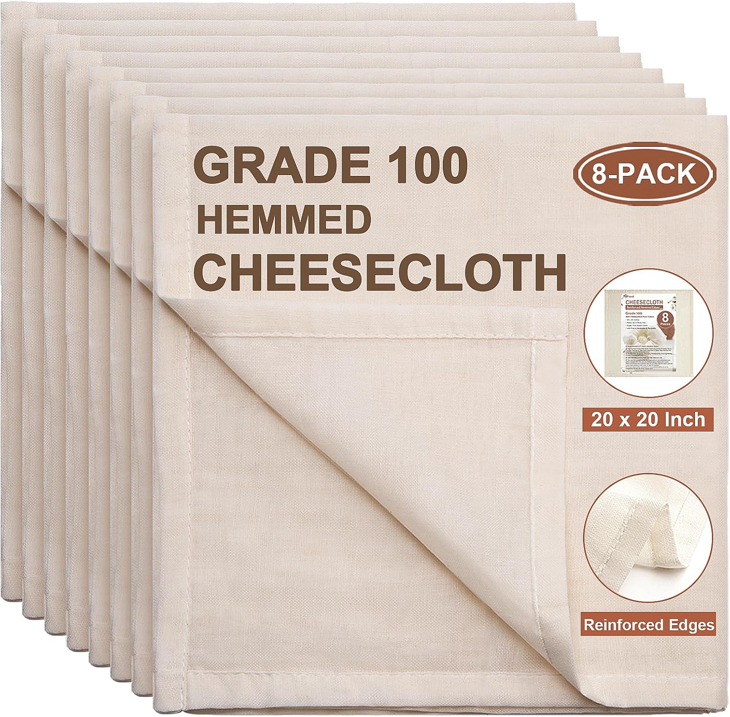 eFond Cheese Cloths | 8-Pack, 20x20Inch Squares with Hemmed Edges | Grade 100 Ultra Fine Reusable Cheesecloth for Straining | Unbleached Cotton Muslin Cloths | For Nut Milk, Butter, Baking & Cooking