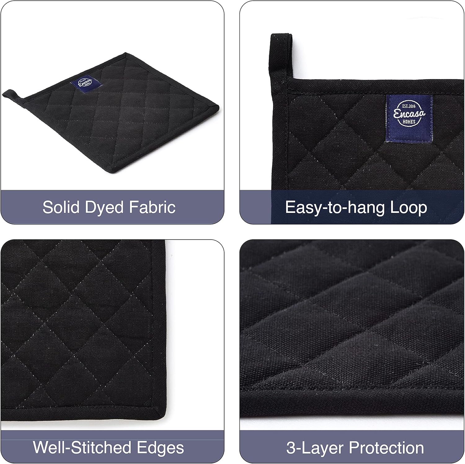 Encasa XO Heat Resistant Cotton Pot Holders with Hanging Loop - Set of 2 - Full Black - Multipurpose Quilted Everyday Hot Pad for Kitchen, Camping, BBQ & Microwave - 8x8 in