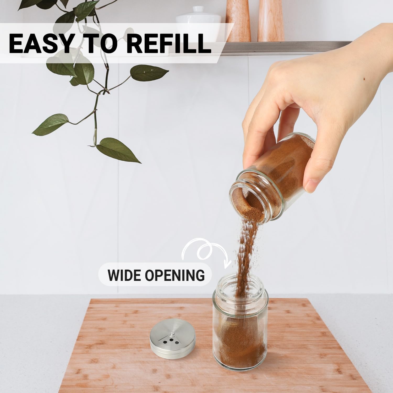 - Sturdy Glass Spice Containers: Our seasoning containers are crafted from high-quality thickened glass, ensuring their durability and sturdiness. Seasoning shakers protects the spices from light, moisture and air, keeping them fresh and flavourful for longer. The transparency of the glass spices jar ensures that you can clearly see the spices in the bottle, so that you can refill it in time.