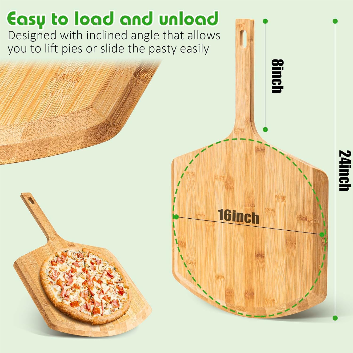 - ă16IN Bamboo Pizza PeelăIndulge in the elegance of our beautifully crafted bamboo pizza peel. Constructed with premium-quality bamboo wood, this pizza peel is built to withstand years of use. The smooth and polished bamboo surface ensures that your dough won't stick, effortlessly sliding off the peel. Measuring at 24 x 16x 0.6 inches, lightweight and easy to maneuver. Meticulously designed for long-lasting durability.