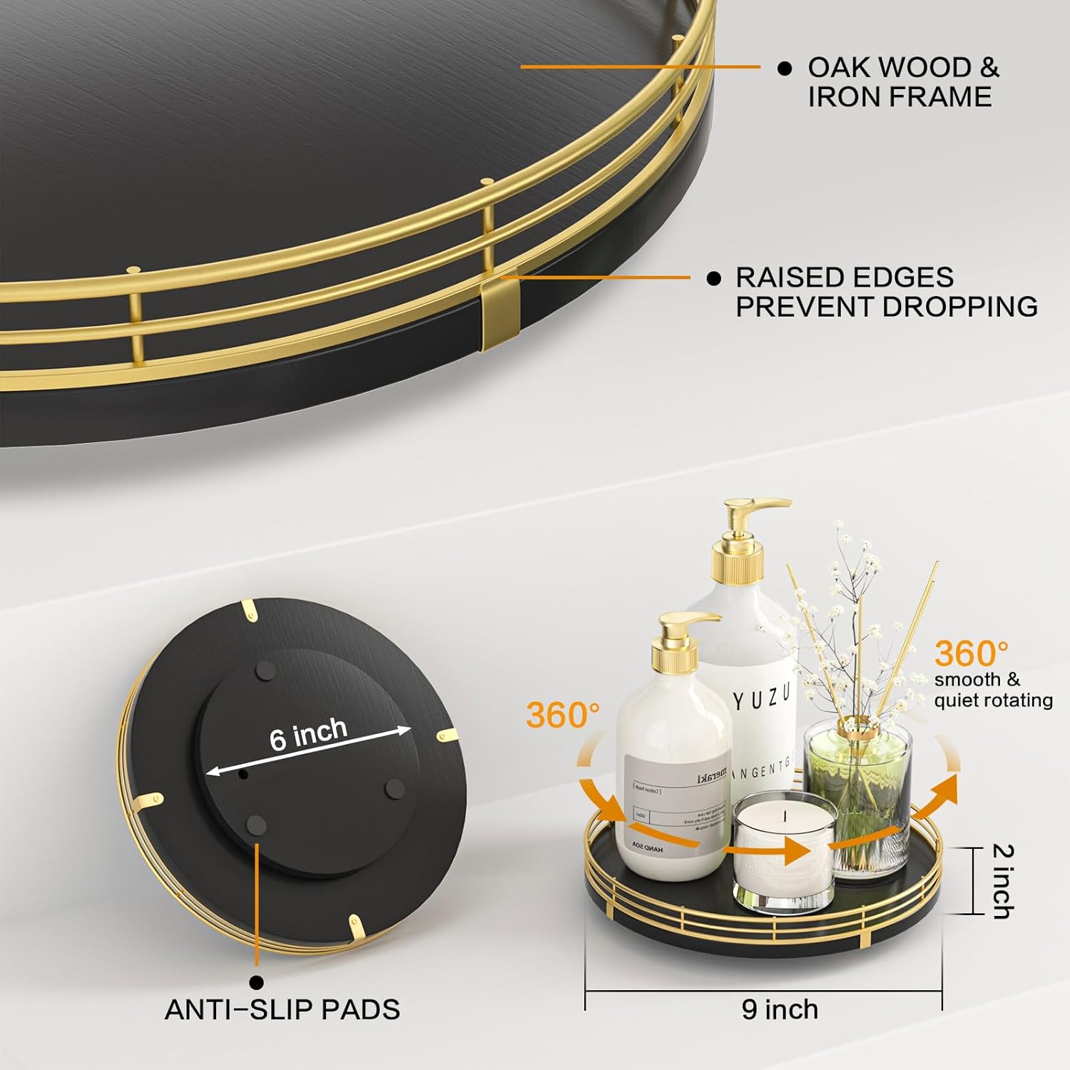 - ๐ง๐ต๐ผ๐๐ด๐ต๐๐ณ๐๐น ๐๐ฒ๐๐ถ๐ด๐ป: The turntable tray features a smooth and silent 360ยฐrotation; Bottom slip-resistant pads for stability and protect your countertop from scratches; Raised edges on each organizer tray to keep items from falling out; Easy to use, no installation required