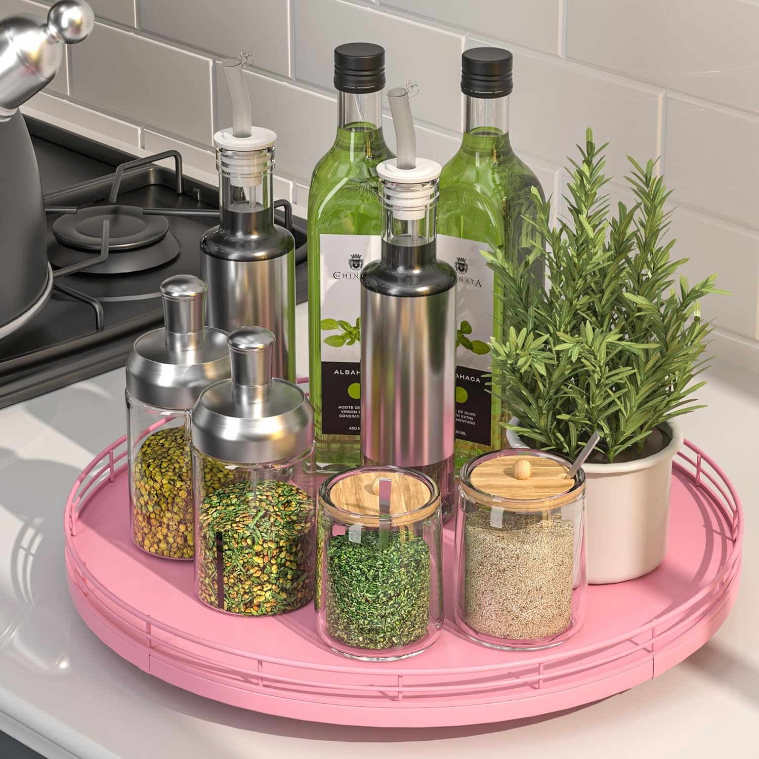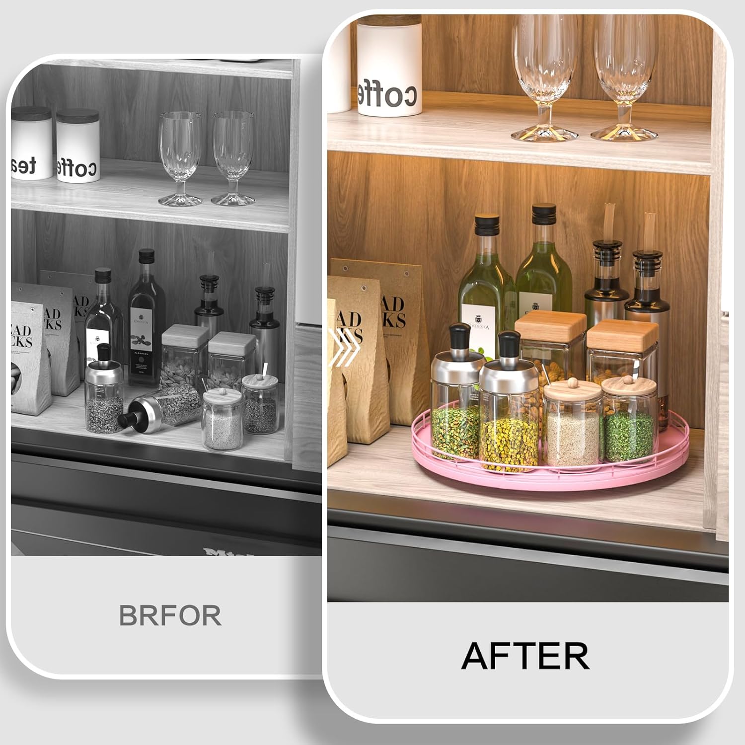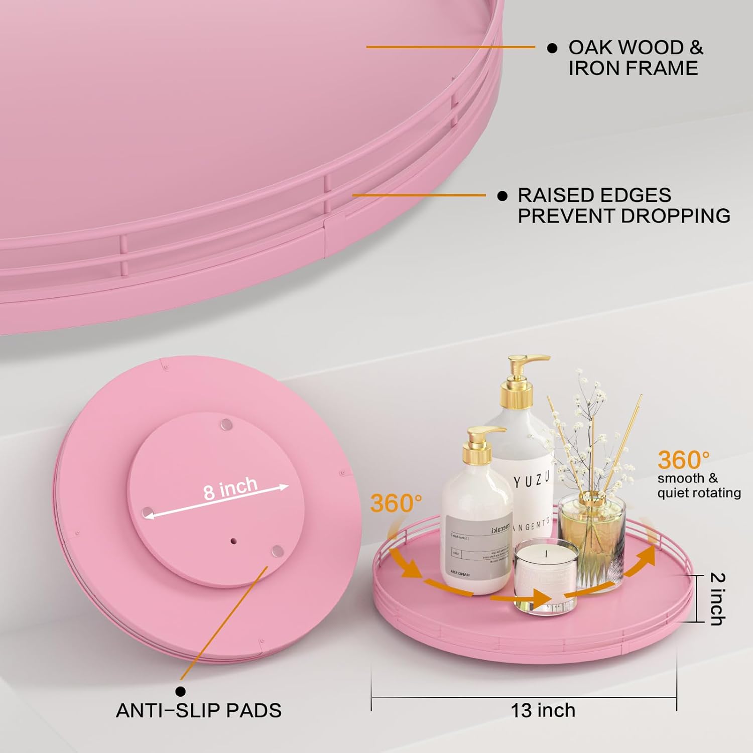 - ๐ง๐ต๐ผ๐๐ด๐ต๐๐ณ๐๐น ๐๐ฒ๐๐ถ๐ด๐ป: The turntable tray features a smooth and silent 360ยฐrotation; Bottom slip-resistant pads for stability and protect your countertop from scratches; Raised edges on each organizer tray to keep items from falling out; Easy to use, no installation required