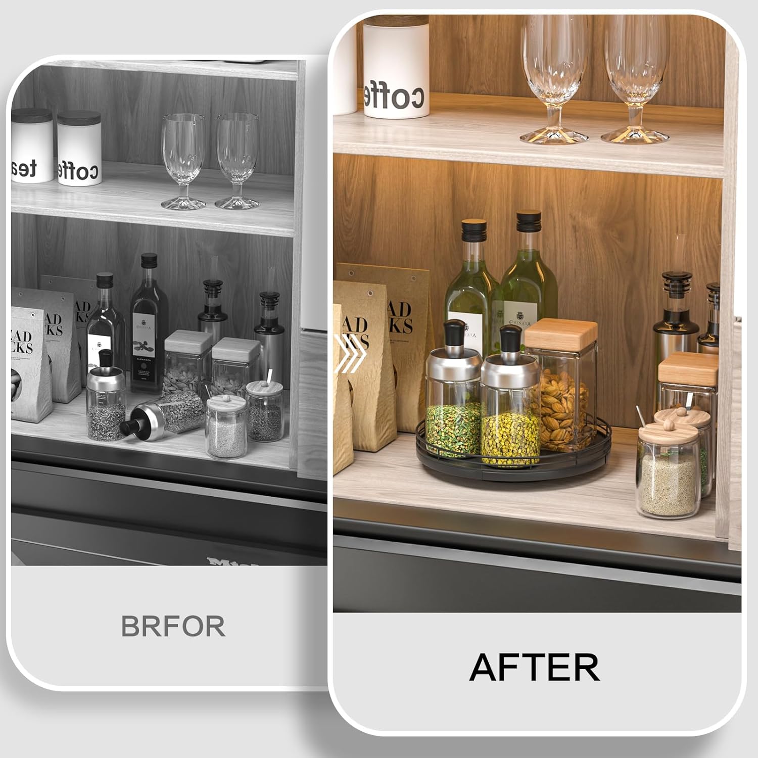 - ๐ง๐ต๐ผ๐๐ด๐ต๐๐ณ๐๐น ๐๐ฒ๐๐ถ๐ด๐ป: The turntable tray features a smooth and silent 360ยฐrotation; Bottom slip-resistant pads for stability and protect your countertop from scratches; Raised edges on each organizer tray to keep items from falling out; Easy to use, no installation required