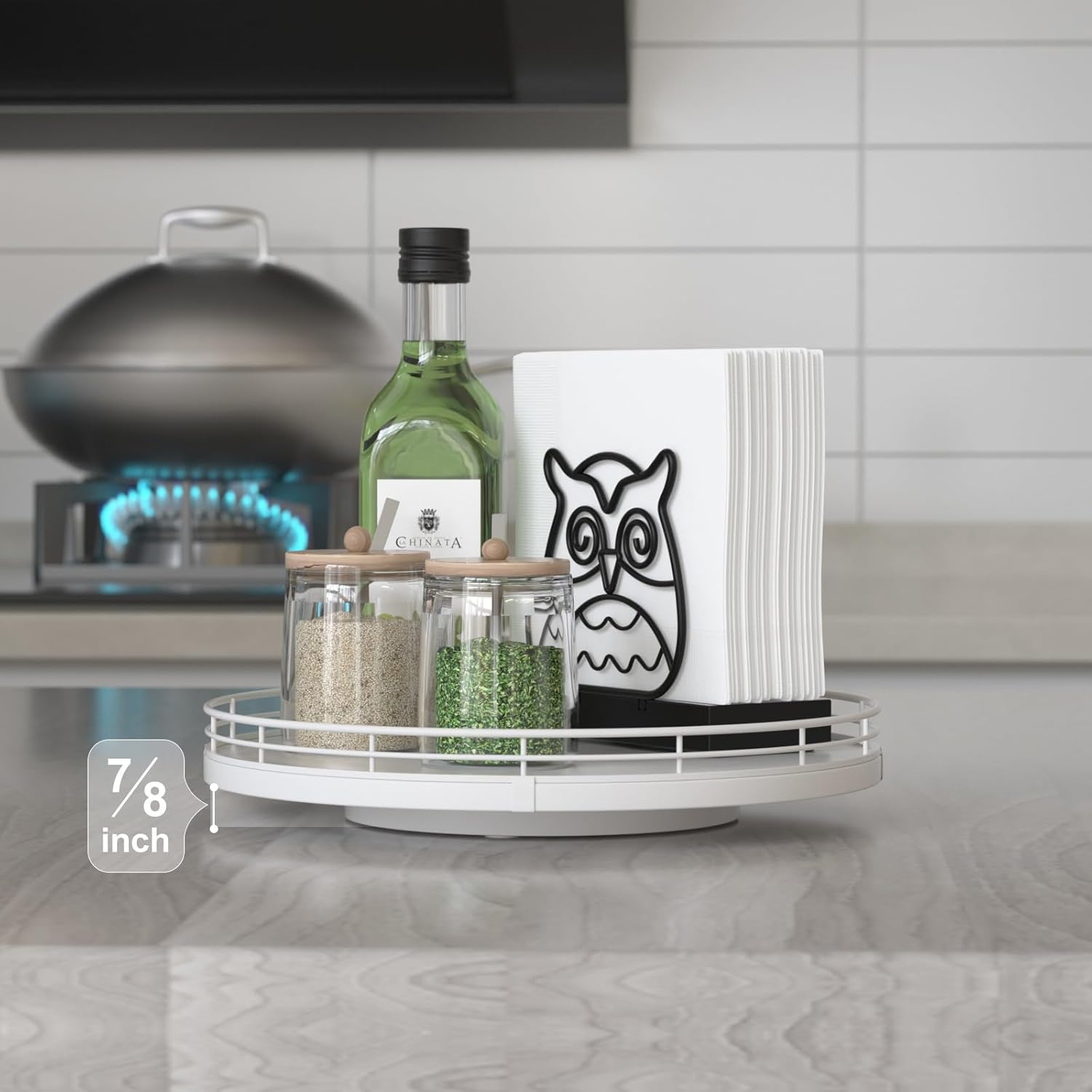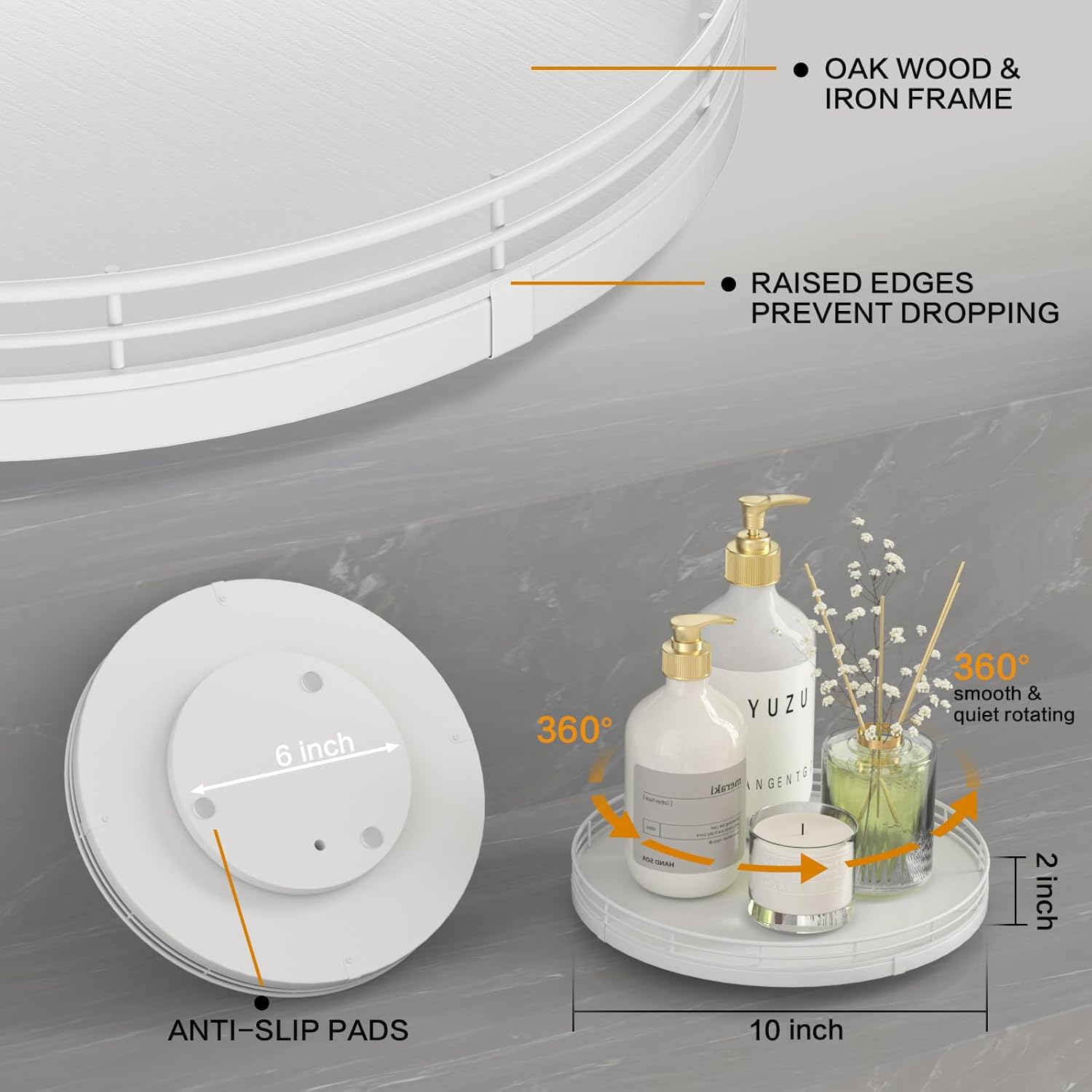 - ๐ง๐ต๐ผ๐๐ด๐ต๐๐ณ๐๐น ๐๐ฒ๐๐ถ๐ด๐ป: The turntable tray features a smooth and silent 360ยฐrotation; Bottom slip-resistant pads for stability and protect your countertop from scratches; Raised edges on each organizer tray to keep items from falling out; Easy to use, no installation required